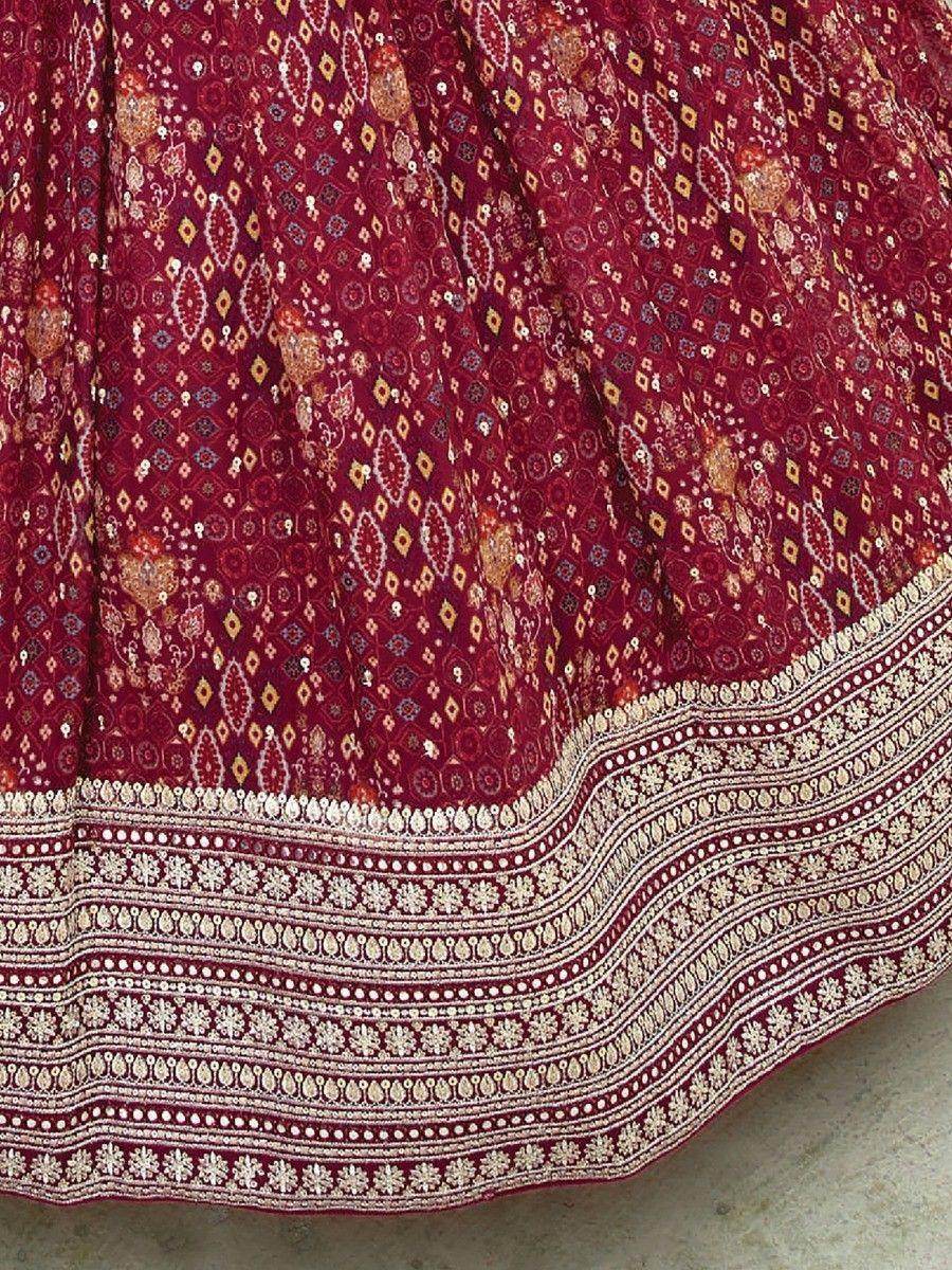 This lehenga choli is an eye-catching design. The maroon color is both elegant and sophisticated, and the digital print work adds a unique touch to the overall look. The combination of zari work, embroidered work, sequins work, and stonework on the lehenga further enhances its allure, making it a truly mesmerizing piece.