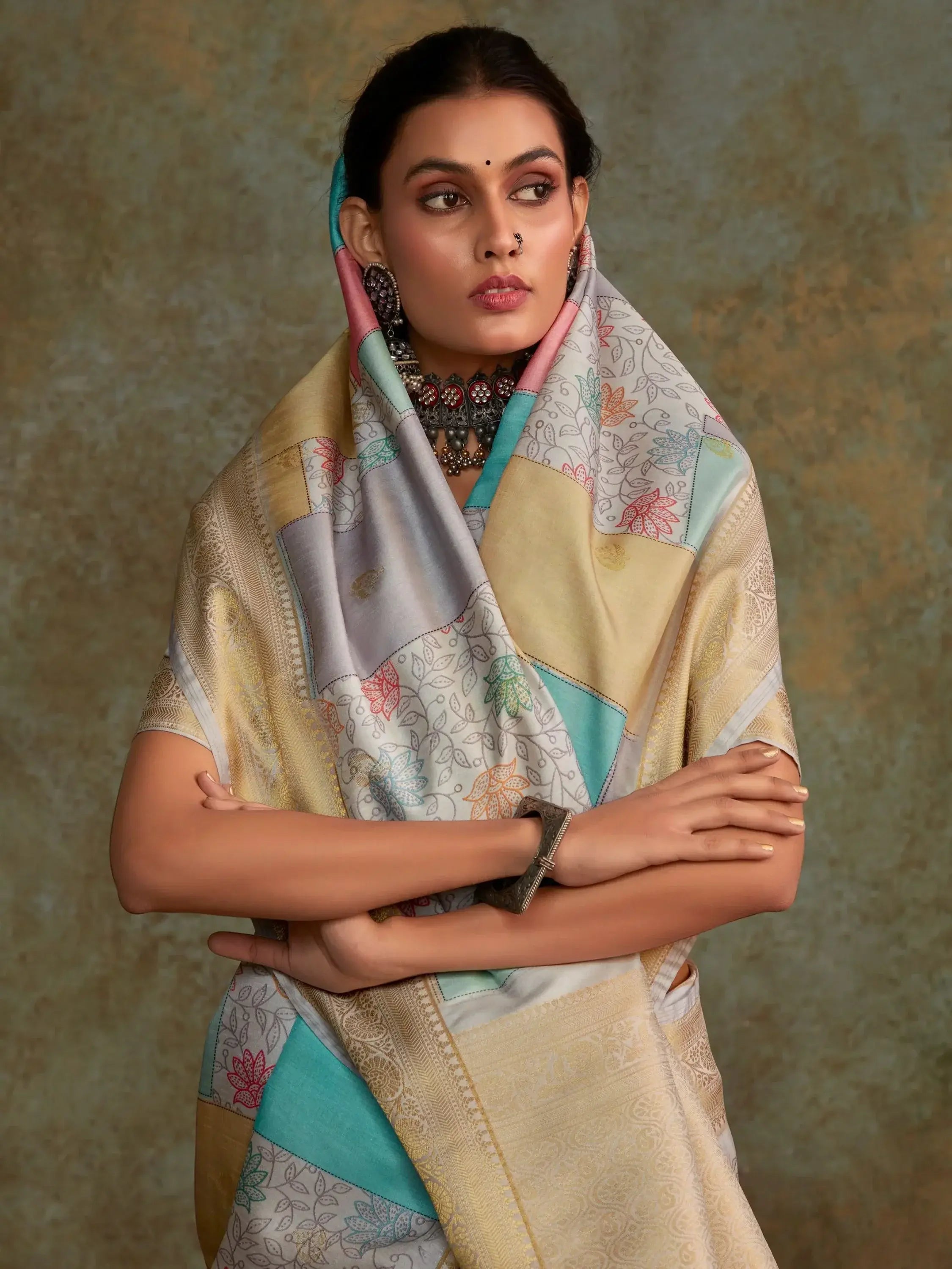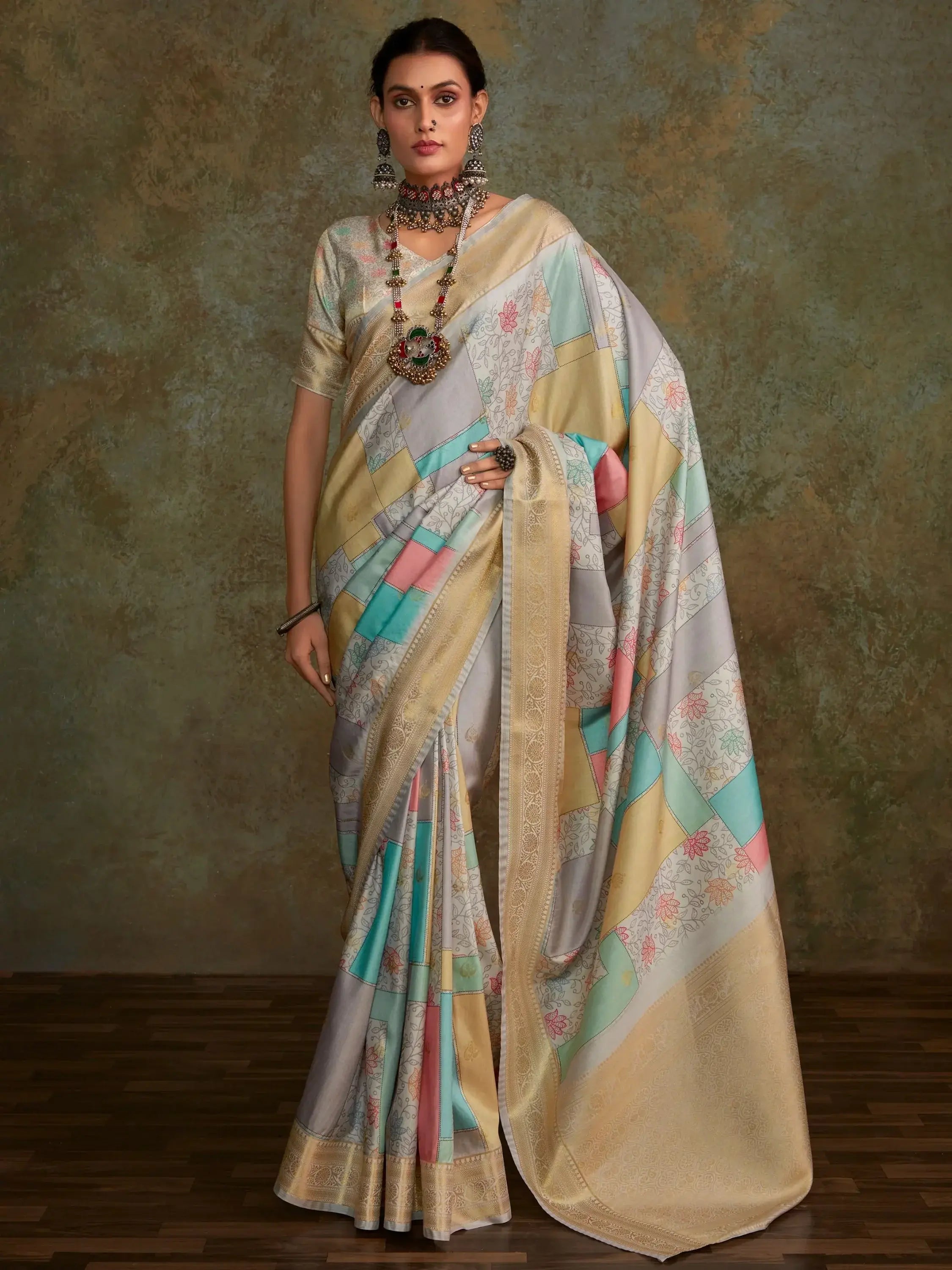 Designed to evoke a sense of timeless charm and modern sophistication, this saree exudes a unique blend of tradition and contemporary flair. The seamless fusion of traditional zari weaving with contemporary digital prints adds a touch of opulence and grandeur to the ensemble, making it a perfect choice for weddings, festivals, and other special celebrations.