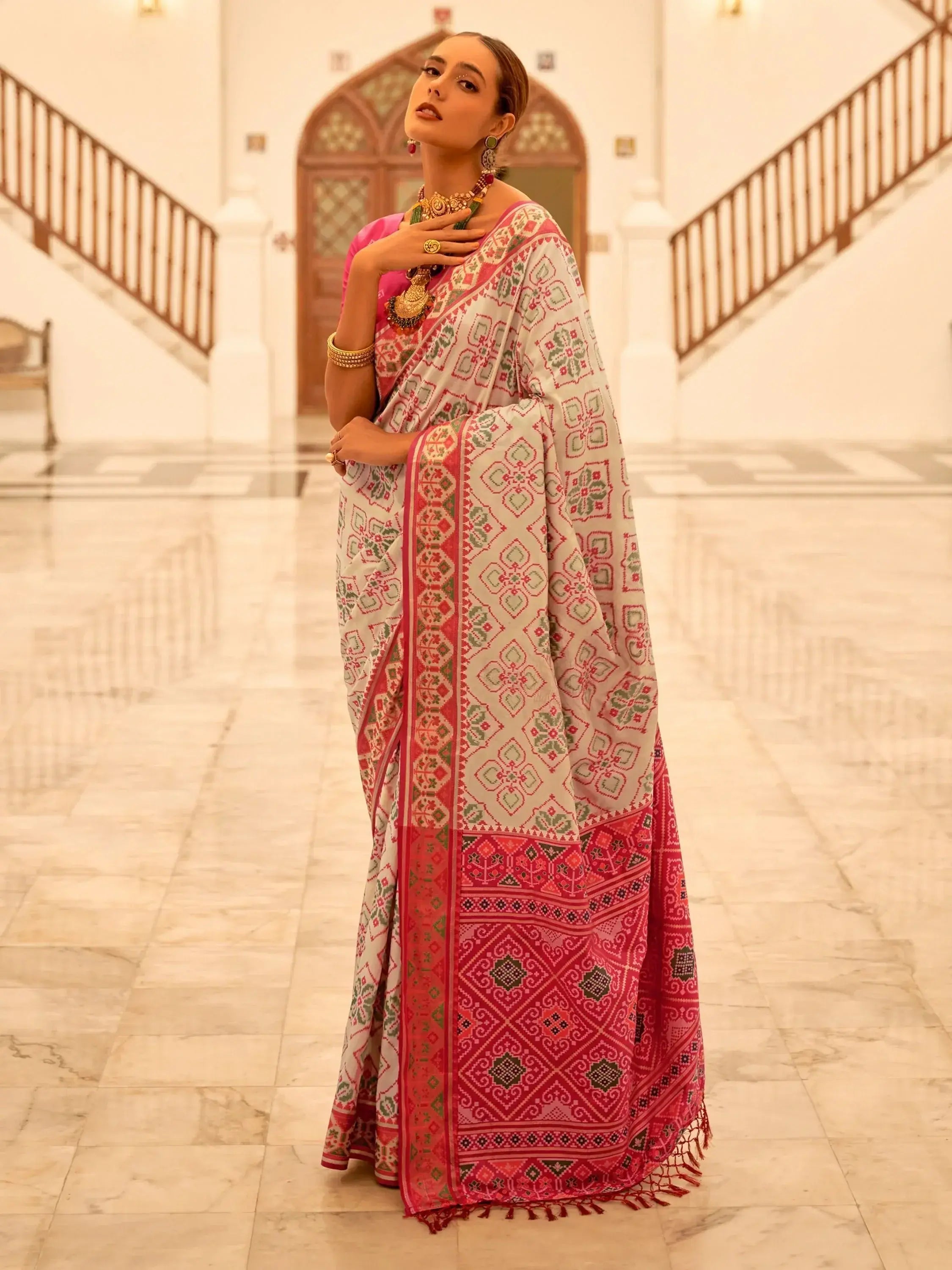 Elevate your ethnic wear collection with this stunning off-white patola printed silk traditional saree with a blouse. This exquisite saree is the perfect choice for weddings, festivals, and other special occasions. The off-white color of the saree beautifully complements the vibrant rani pink banarasi silk blouse, both adorned with intricate patola print work.