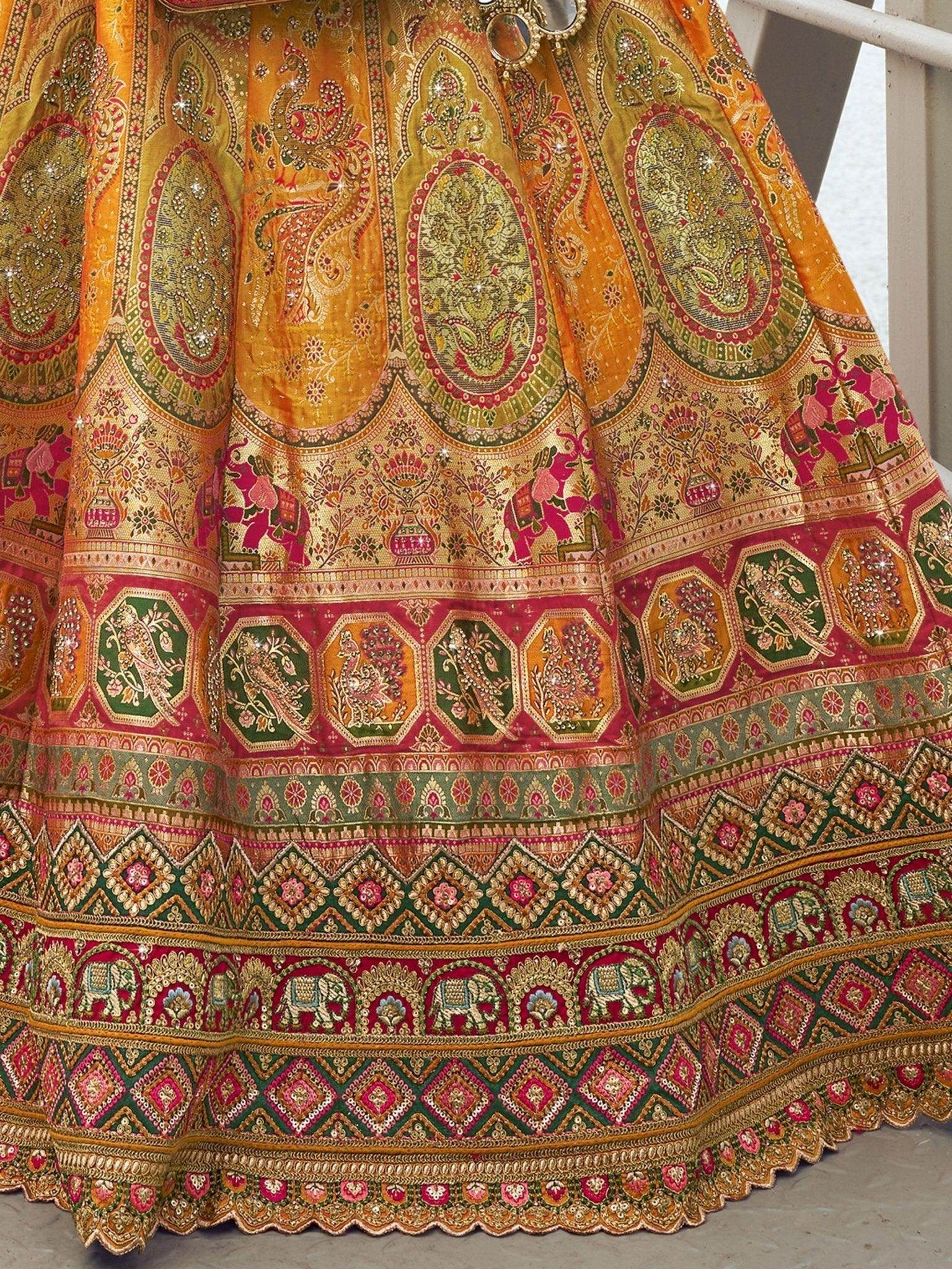 Make a bold statement at your wedding with this stunning orange lehenga choli from ethnic plus. Crafted from luxurious banarasi silk, the lehenga features exquisite zari, thread, and sequins embroidery, ensuring a dazzling presence at any event.