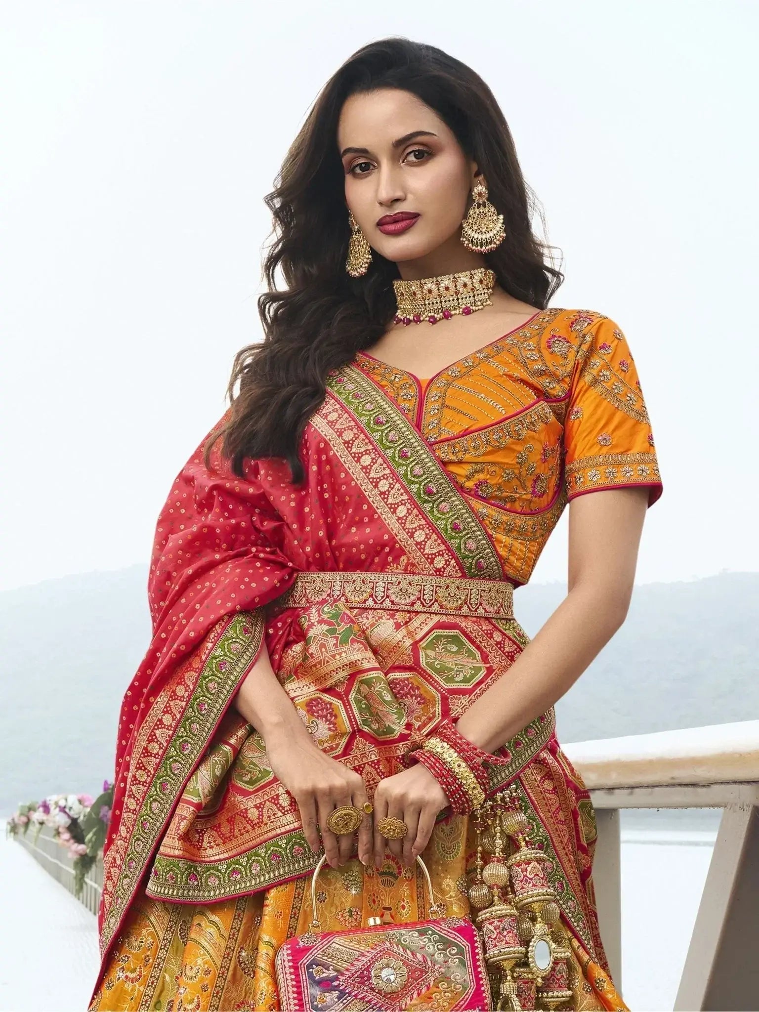 The vibrant orange lehenga is paired with a matching blouse in banarasi silk, which complements the detailed embroidery and adds to the overall elegance. An embroidered waist belt and latkan enhance the traditional appeal, providing a perfect fit for a bride.