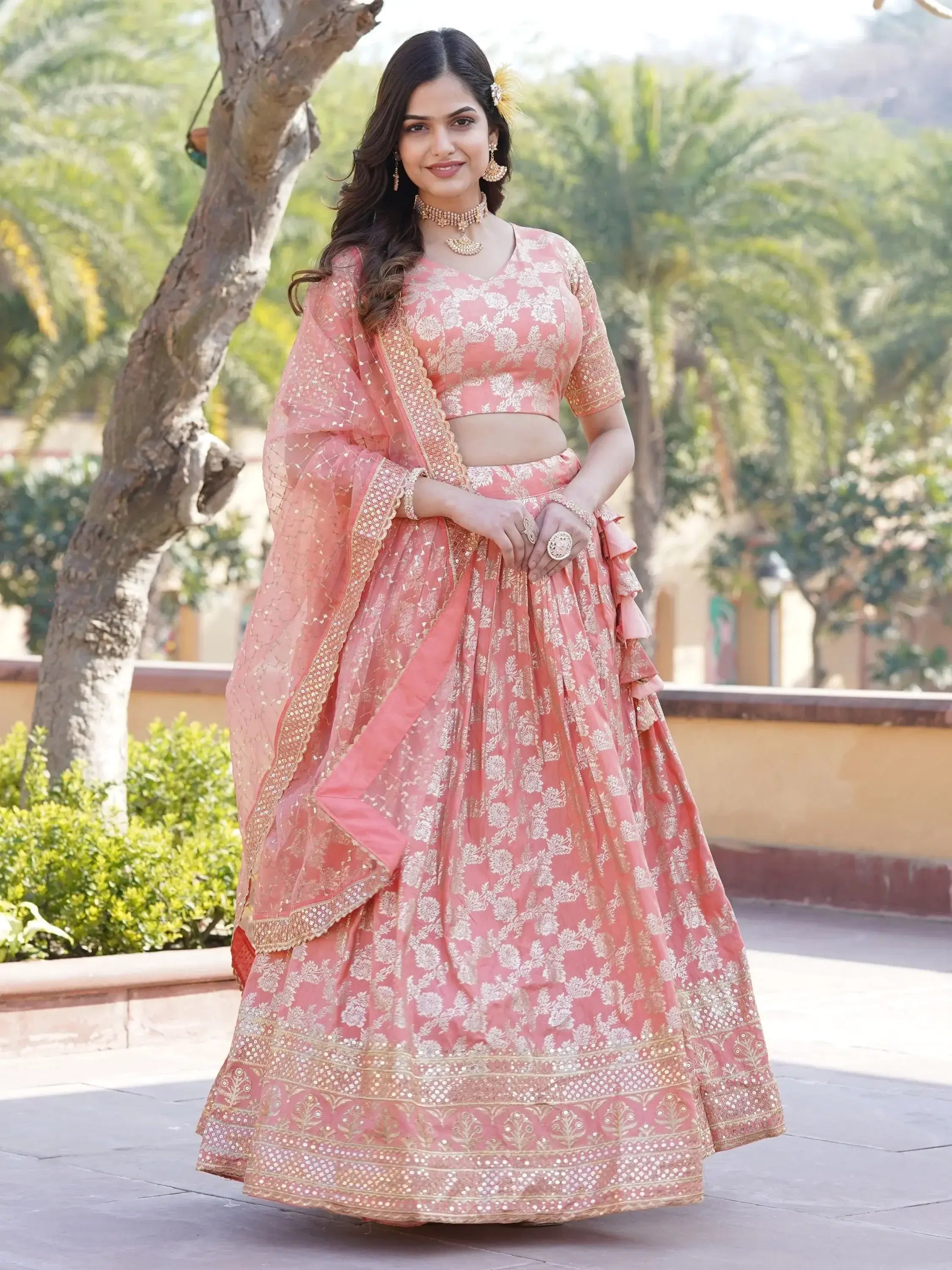 Don't miss out on this exquisite piece from Ethnic Plus. Elevate your ethnic wear collection with our latest range of stunning peach embroidered jacquard engagement wear lehenga choli. Shop now and grab all the new arrivals to add a touch of elegance to your wardrobe.
