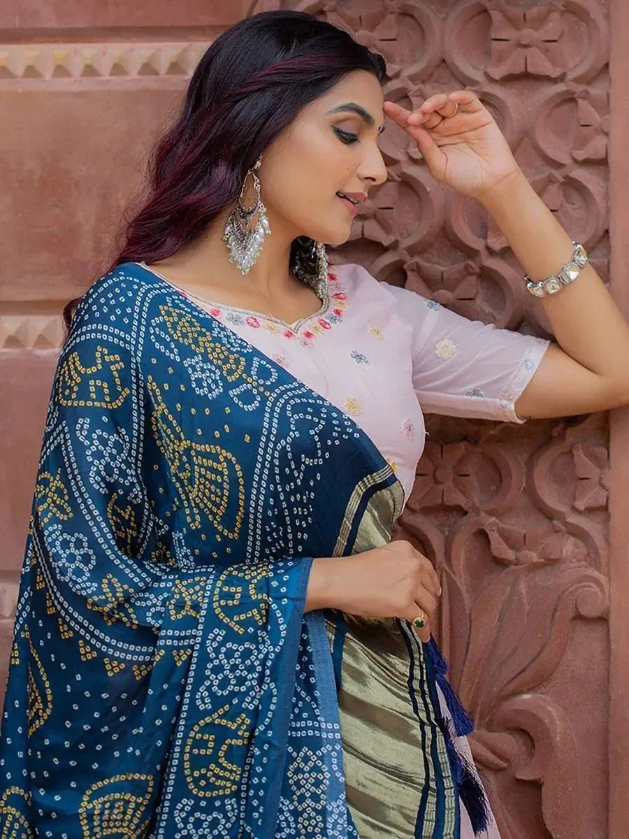 Accomplished with similar color peach choli in heavy sequins embroidery and floral embroidery work in georgette with gaji silk bandhej digital dupatta print with fancy tessel.