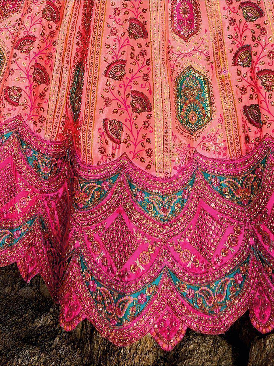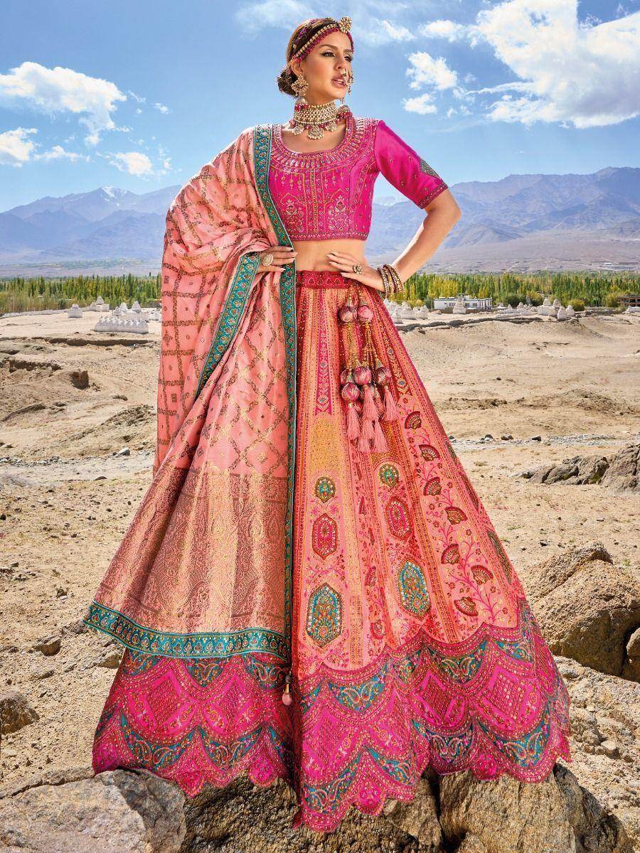 Introducing our stunning pink embroidered jacquard silk traditional lehenga choli, a must-have addition to any stylish woman's wardrobe. This elegant ensemble features a pink color jacquard silk material lehenga, adorned with exquisite embroidered work, sequin work, cutwork, butta, and handwork.