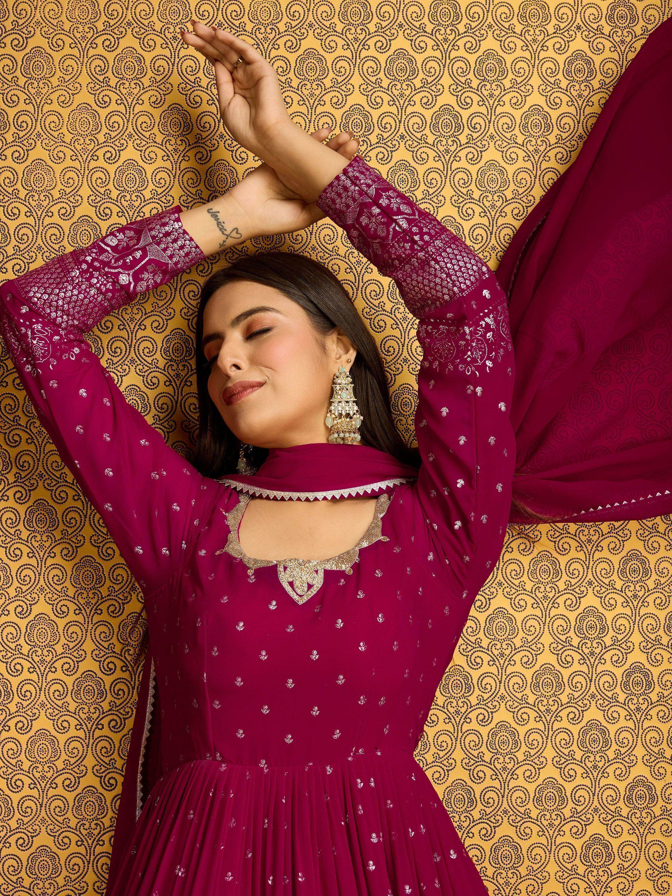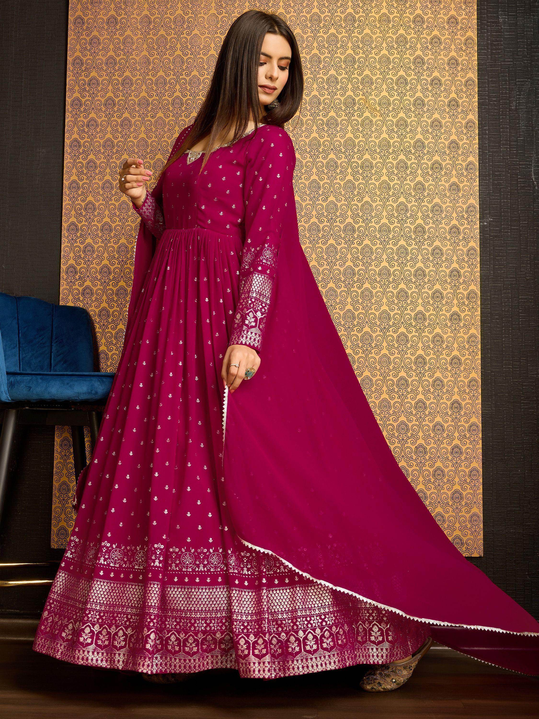 This pink festival wear gown is a must-have for your ethnic wear collection. Dress it up with matching accessories and heels for a complete look that will turn heads wherever you go. Don't miss out on this stunning piece that is sure to become a favorite in your wardrobe. Shop now and experience the beauty and elegance of our stunning pink foil work georgette reception wear gown with dupatta.