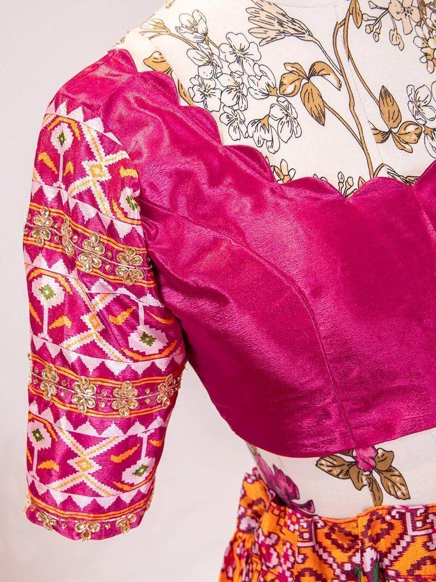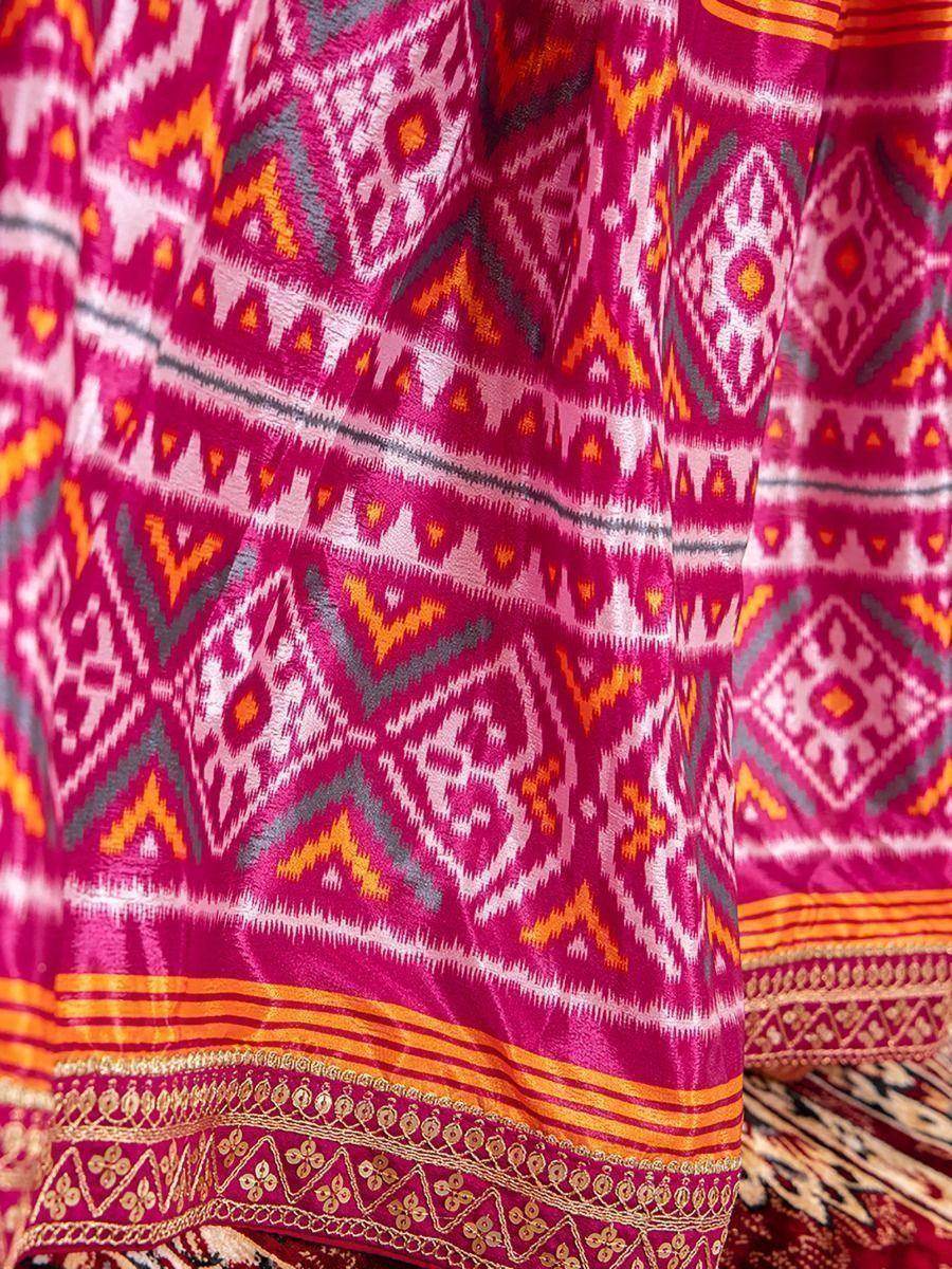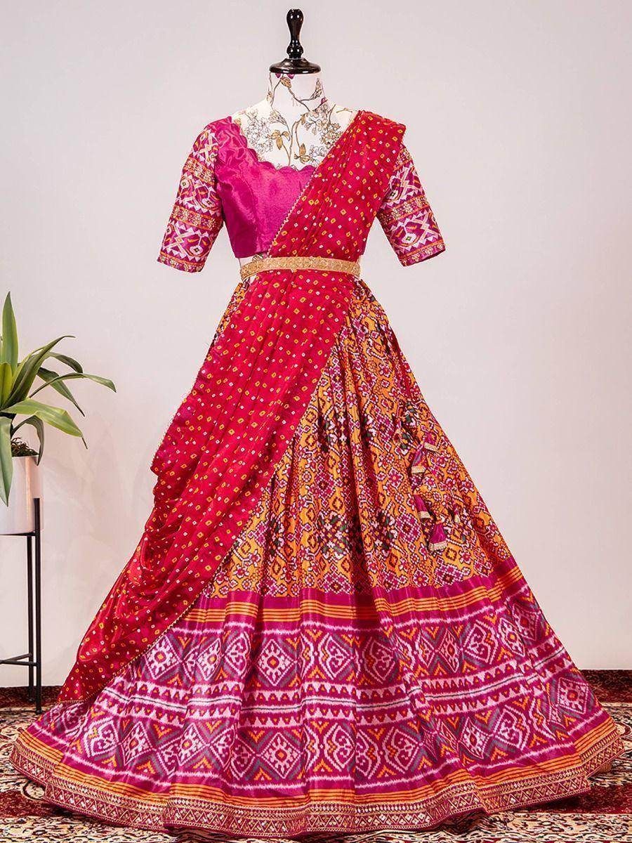Put up this pink patola lehenga with chinon patola printed choli in red color with cut dana hand work and patola print with gotta patti lace border also comes with tassels.