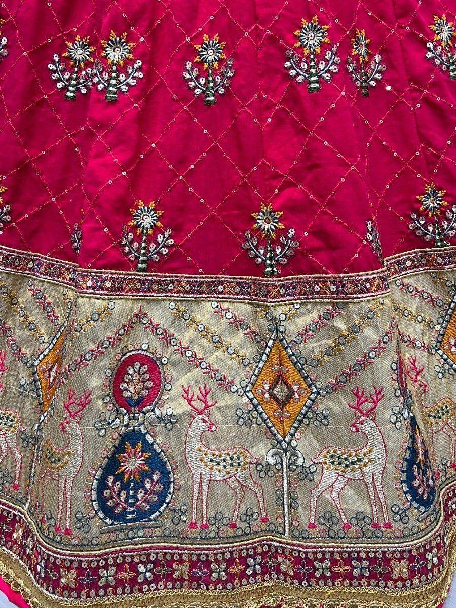 The lehenga features a mesmerizing pink color, made from high-quality gadhawal silk material. It boasts intricate and fancy embroidered work, sequin work, zari work, paper mirror work, and zircon work, adding an extra touch of elegance and glamour to your look. The semi-stitched lehenga can be easily adjusted to fit up to 42 inches.