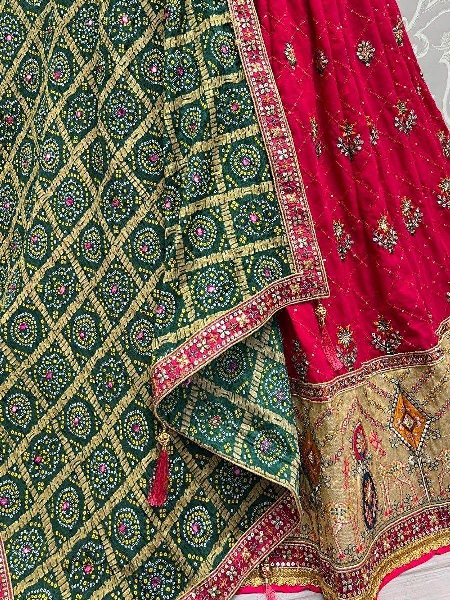 To complete the ensemble, a green color chiffon dupatta is included. It features bandhani print work and a fancy lace border, adding a touch of tradition and sophistication to your overall look.