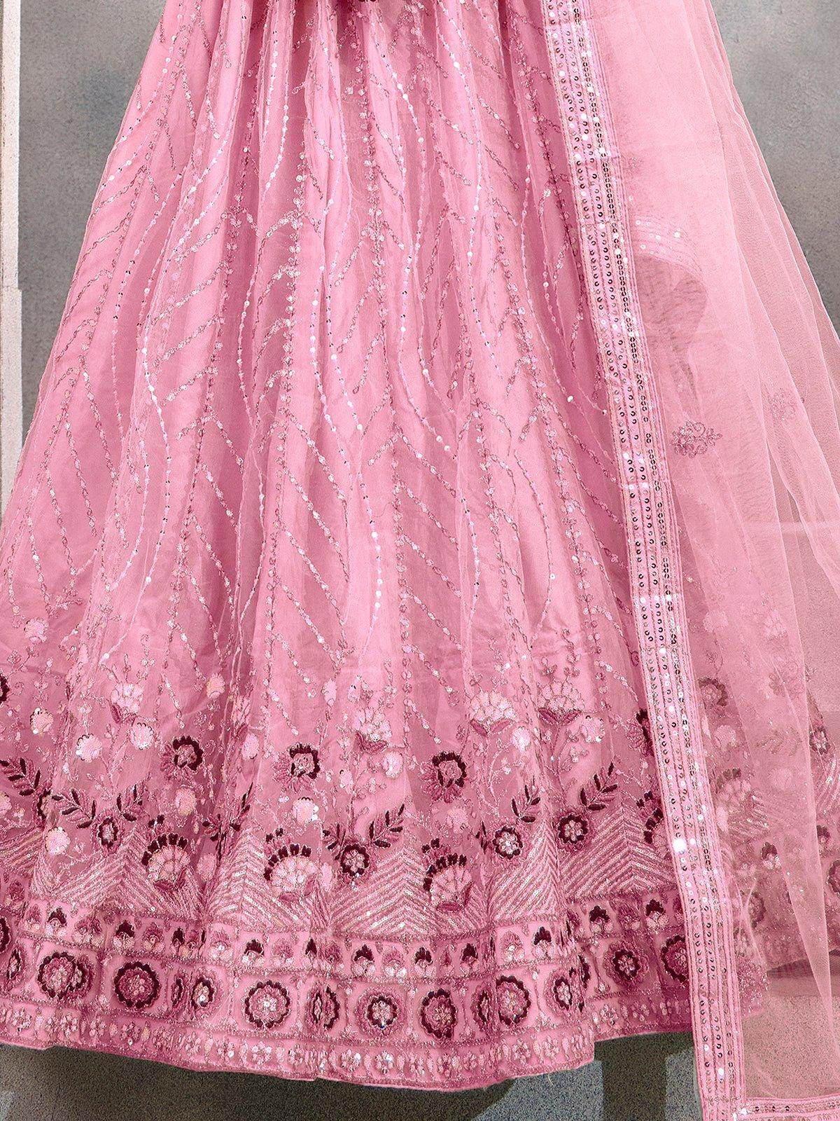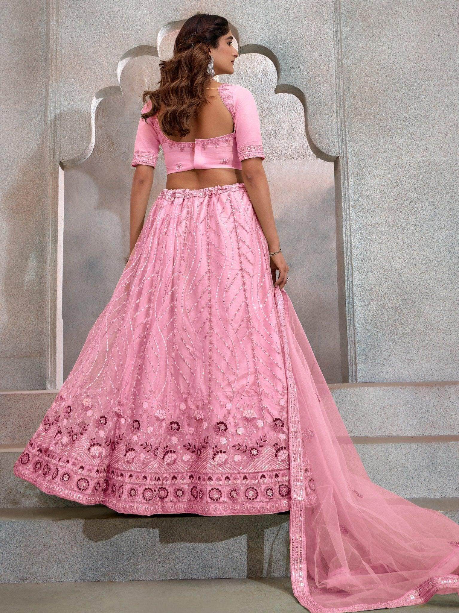 This gorgeous ensemble features a pink color net lehenga with intricate sequin work and thread embroidered detailing, paired with a matching net choli also adorned with sequin work and thread embroidery.