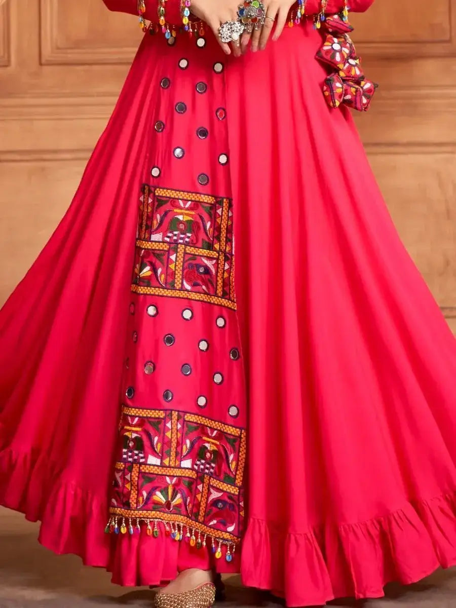 But what truly sets this outfit apart is its meticulous decoration. Adorned with multi-color thread embroidery, this navratri lehenga choli incorporates stunning mirror work, which adds that extra touch of sparkle. The combination of vibrant colors and intricate detailing makes this outfit a true showstopper.