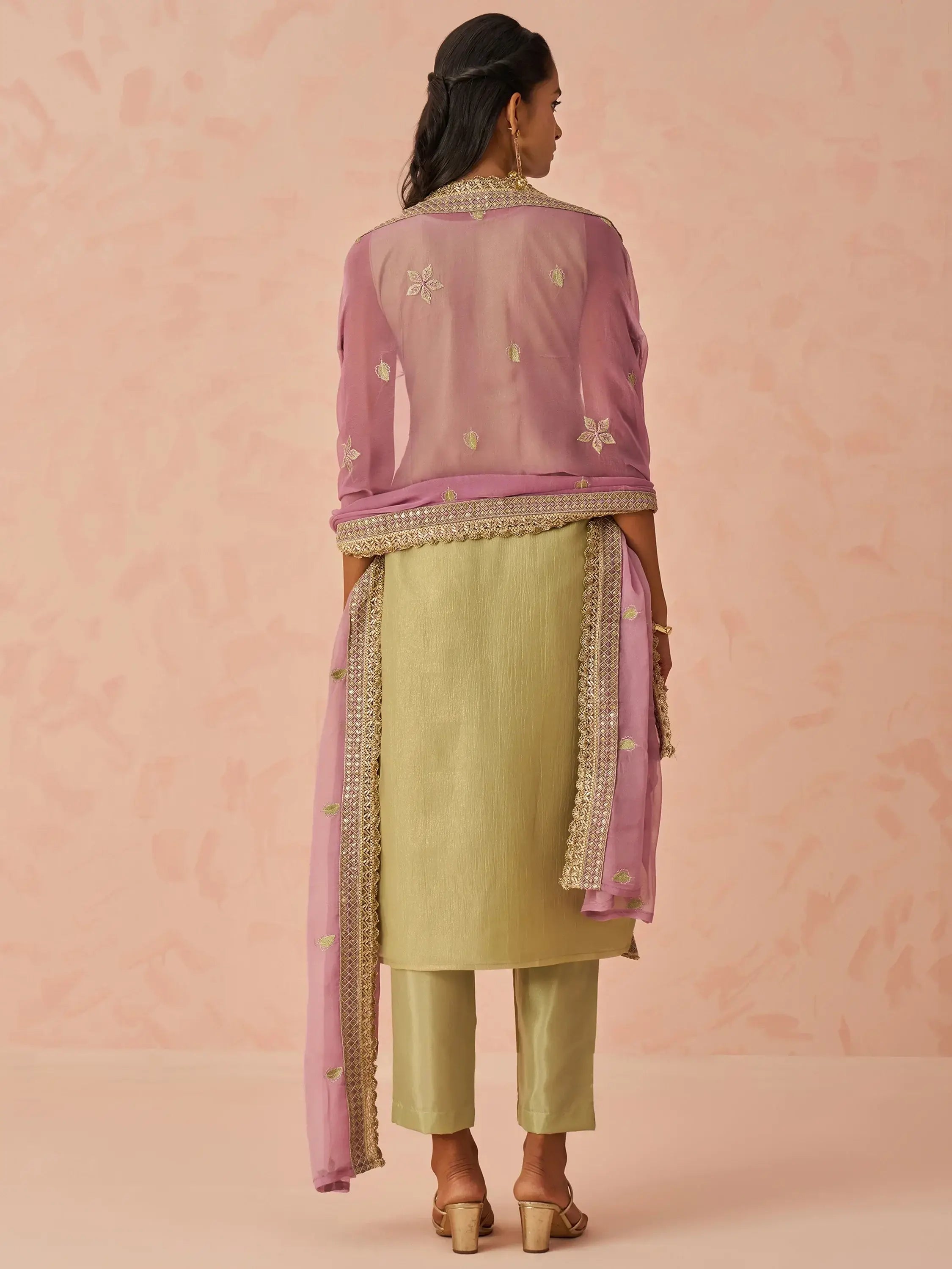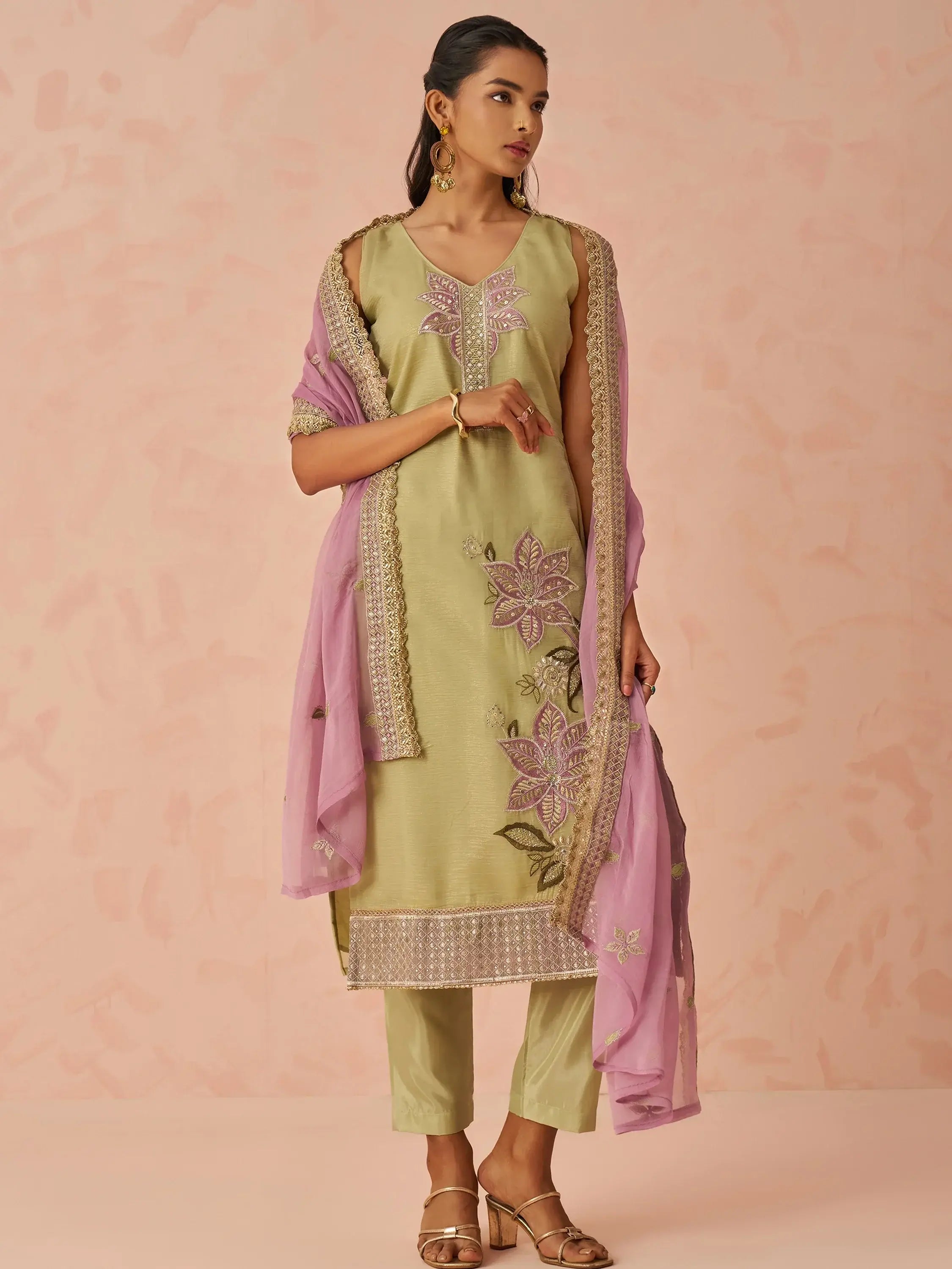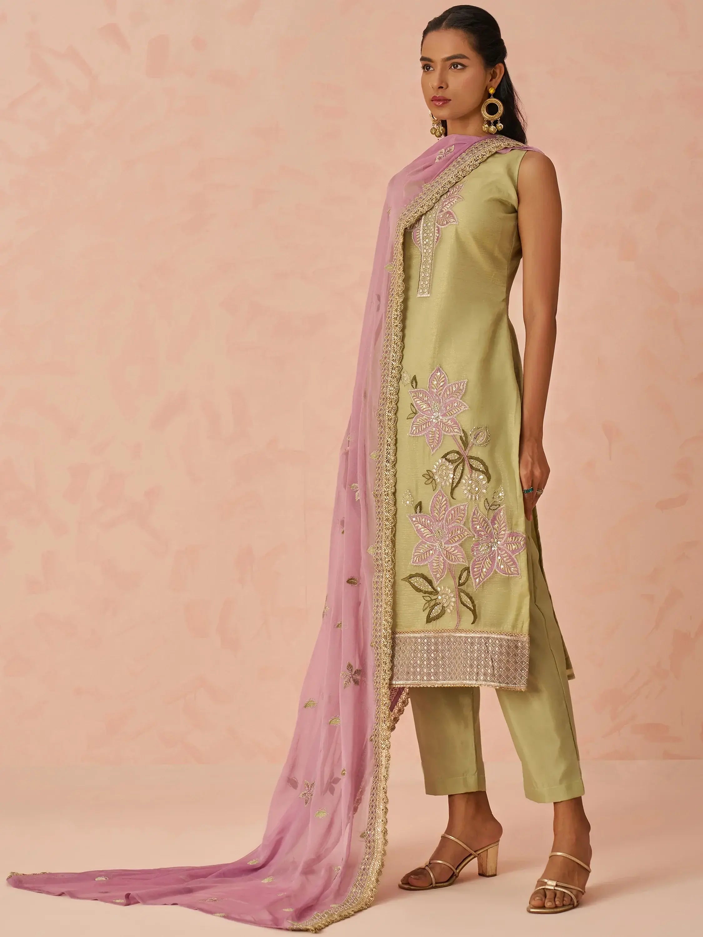 Elevate your festive wardrobe with this stunning pista green crush silk pant suit, designed to blend comfort with elegance. The straight-cut top is beautifully adorned with floral thread and sequins embroidery, offering a touch of glamour while still keeping things graceful. The soft sheen of the crush silk fabric adds richness to the overall look, making it perfect for special festive gatherings.