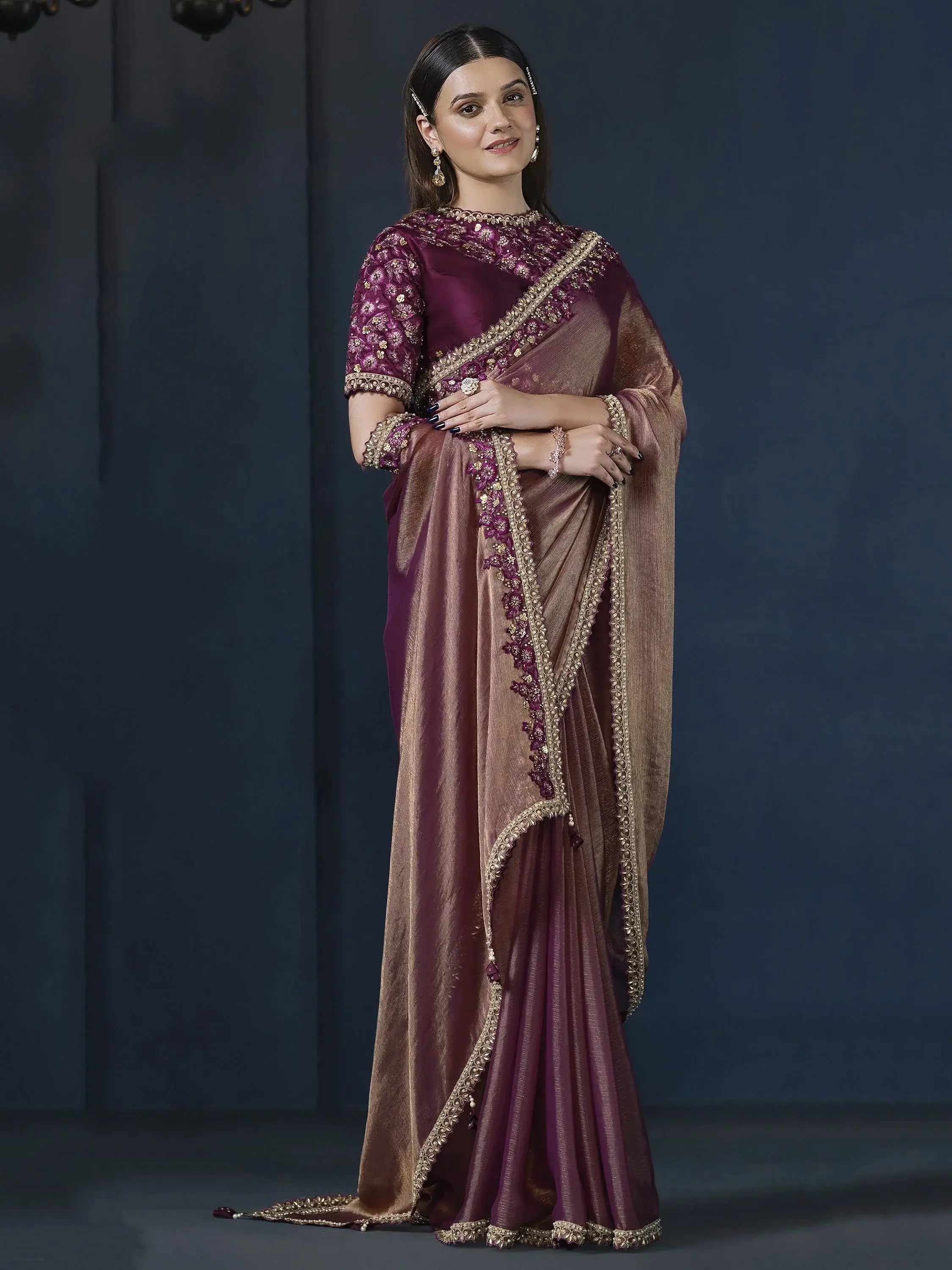 Unveiling the epitome of elegance, this exquisite purple saree captures the spirit of celebration with its stunning diamond work and intricate dori embroidery. Enhanced with delicate sequin detailing, the vibrant hue of purple shines, making it a perfect choice for festive occasions. The thoughtful craftsmanship transforms this traditional attire into a dazzling statement piece.