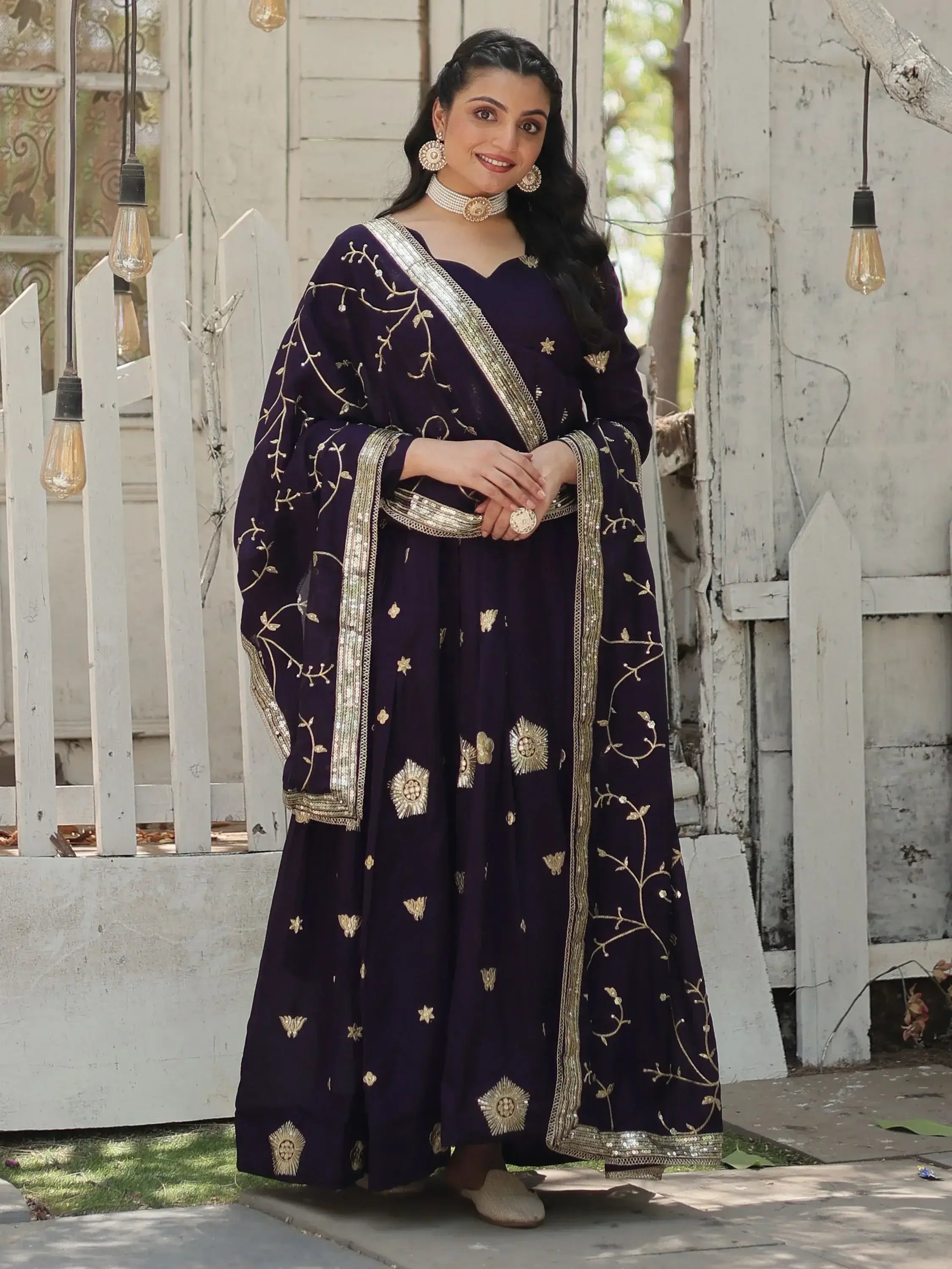 Introducing our stunning purple embroidered silk wedding wear gown with dupatta, the perfect outfit for any special occasion. This gown is the epitome of elegance with its rich sequins and intricate embroidered work, making you feel like royalty as you grace any event.