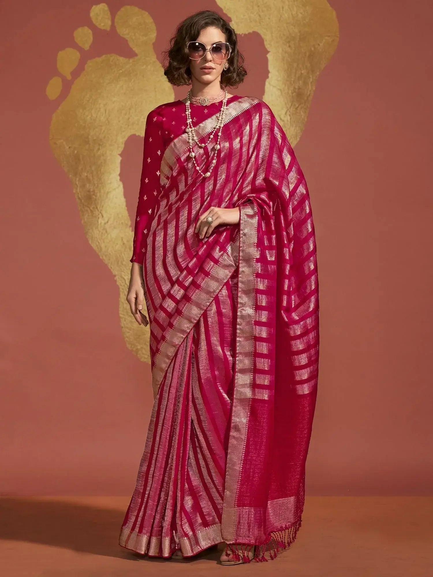 The rani pink color viscose silk saree adorned with exquisite zari weaving work. Paired with a matching viscose silk blouse featuring the same intricate detailing, this ensemble exudes opulence and sophistication. With a generous length of 5.50 meters, the saree offers ample fabric for graceful draping, while the unstitched blouse material allows for customization to ensure a perfect fit.
