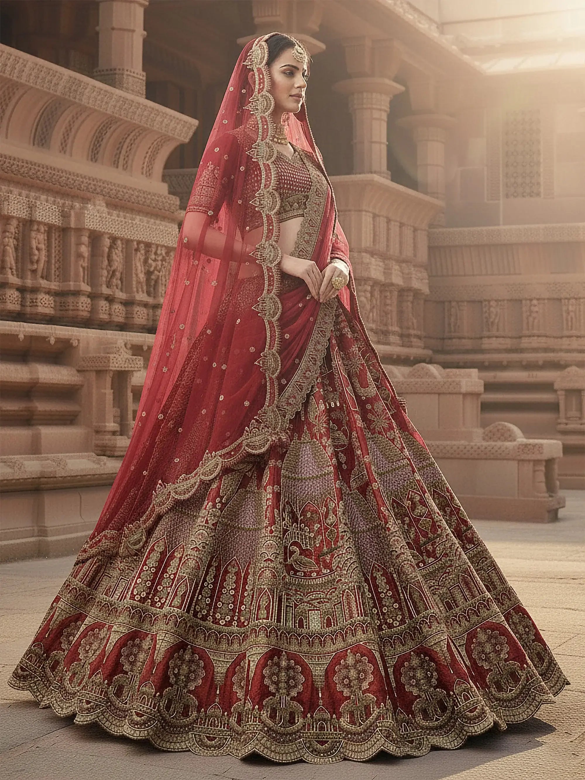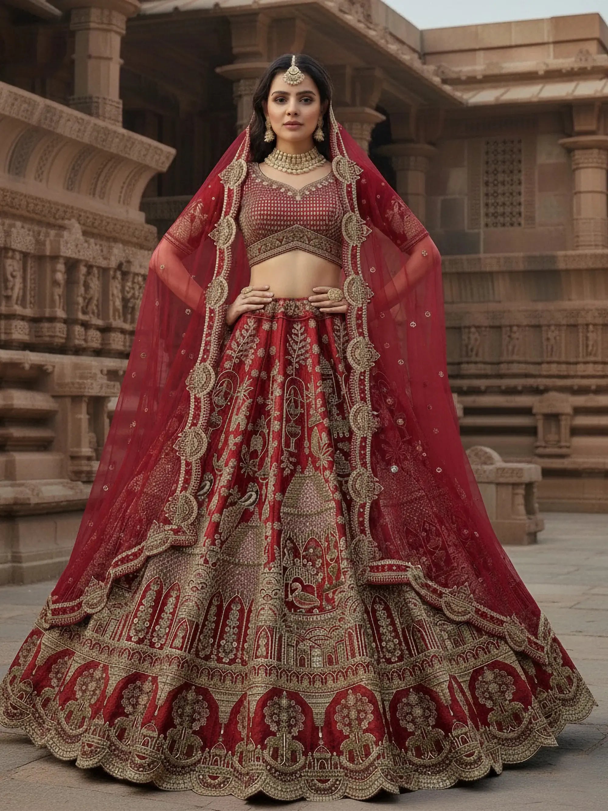 This heavy silk bridal lehenga features handwork khatali, crystal motif & pipe work, dori embroidery, multi-thread detailing, and sequin-zari finishing. It is stitched in heavy bridal style with double-layer cancan and offers a full 4-meter grand flair.