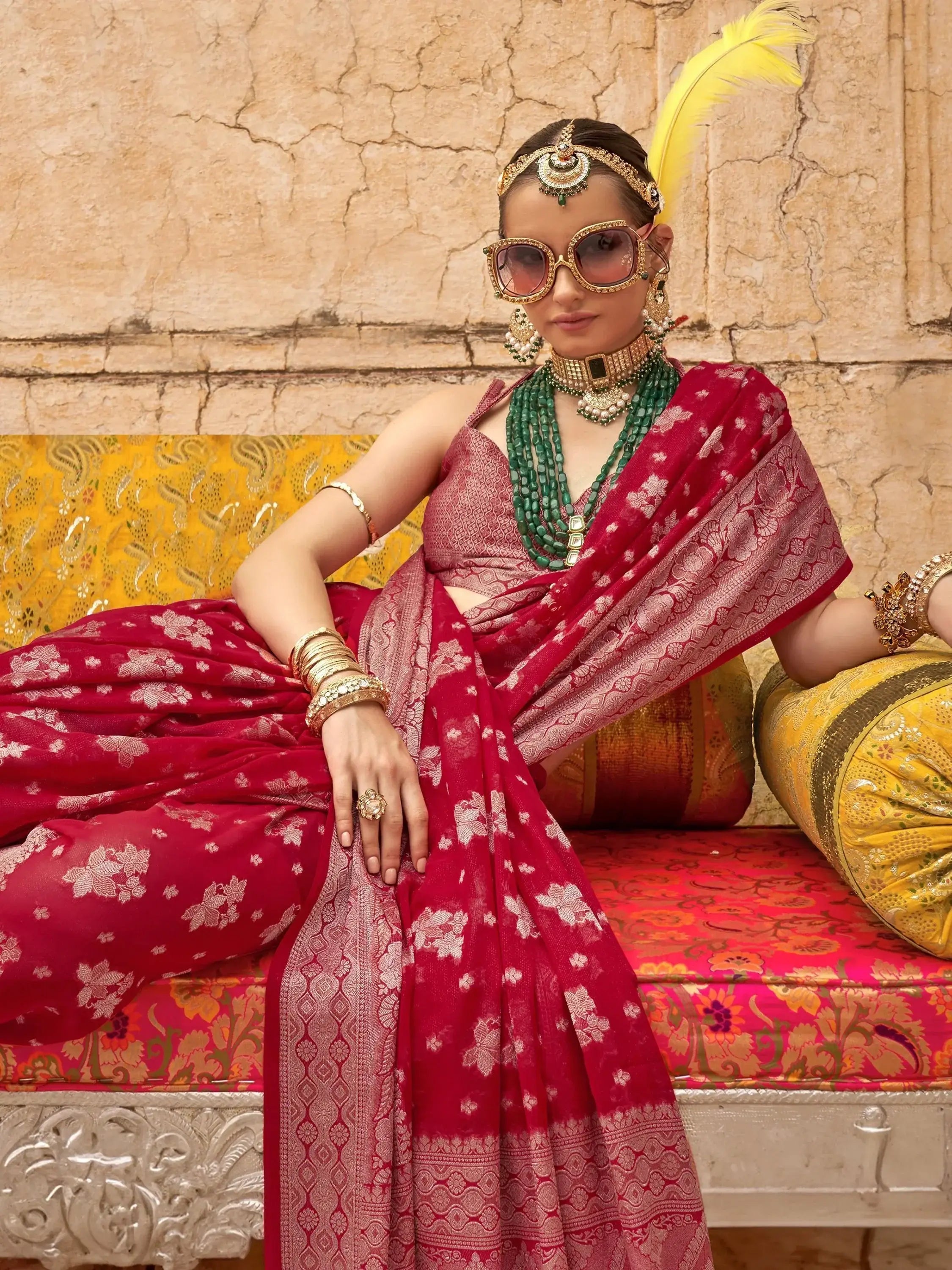 Introducing a stunning red georgette saree that redefines elegance with its exquisite design and craftsmanship. This beautiful piece is adorned with intricate designer zari weaving, featuring a stunning butta border and pallu enhanced with a premier coating and a soft touch finish. The vibrant red shade is not just a color; it's a statement, making it a perfect choice for weddings and formal gatherings.