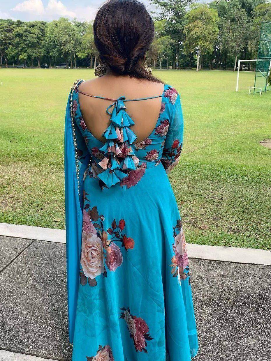 Let your elegance reflect and get compliments with this beautiful sky blue color Anarkali gown made of georgette material embellished with printed work all over with tassels.
