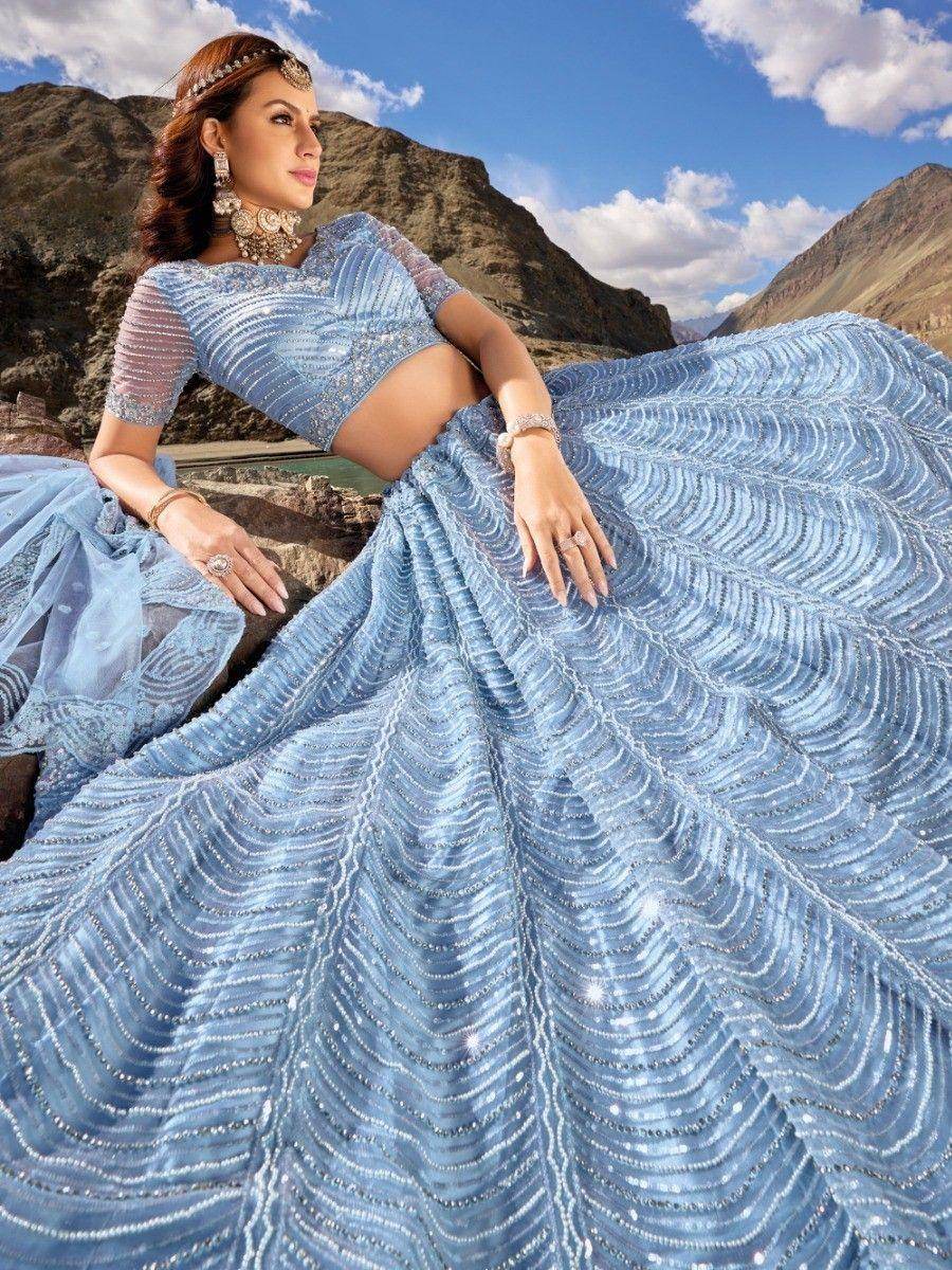 Our stunning sky-blue sequins reception wears a lehenga choli is the perfect choice for women who want to make a lasting impression at their special events. The combination of the sky-blue color, heavy sequin work, and intricate design details create a mesmerizing ensemble.