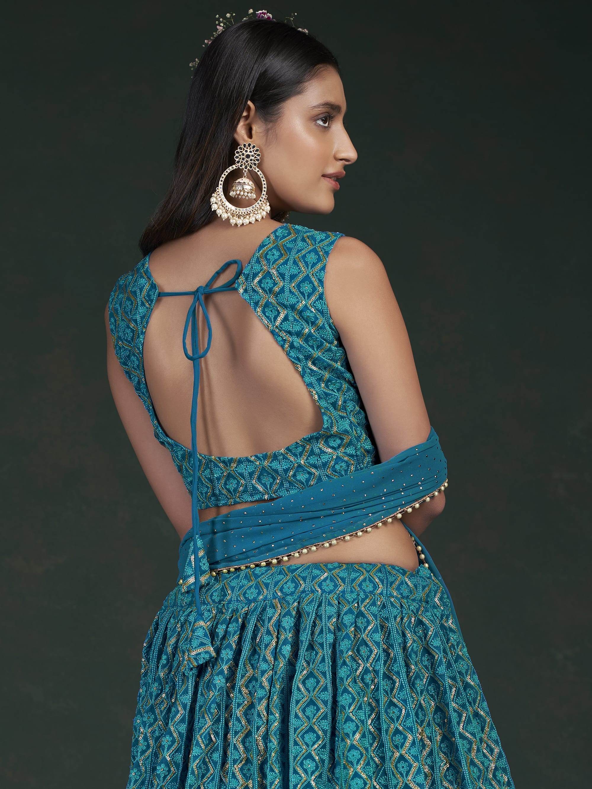 Create an opulent effect with your fashion sense by wearing this elegant teal-blue color lehenga made with georgette material accomplished with sequins and thread embroidery.