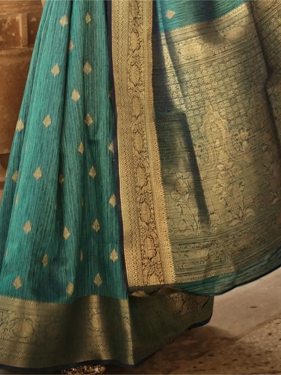 The stunning teal green zari weaving silk function wear saree with a blouse is a statement piece that embraces traditional charm with a modern twist. Its teal green color, zari weaving work, luxurious silk material, and customizable blouse make it a wardrobe staple for weddings, festivals, and other special occasions.