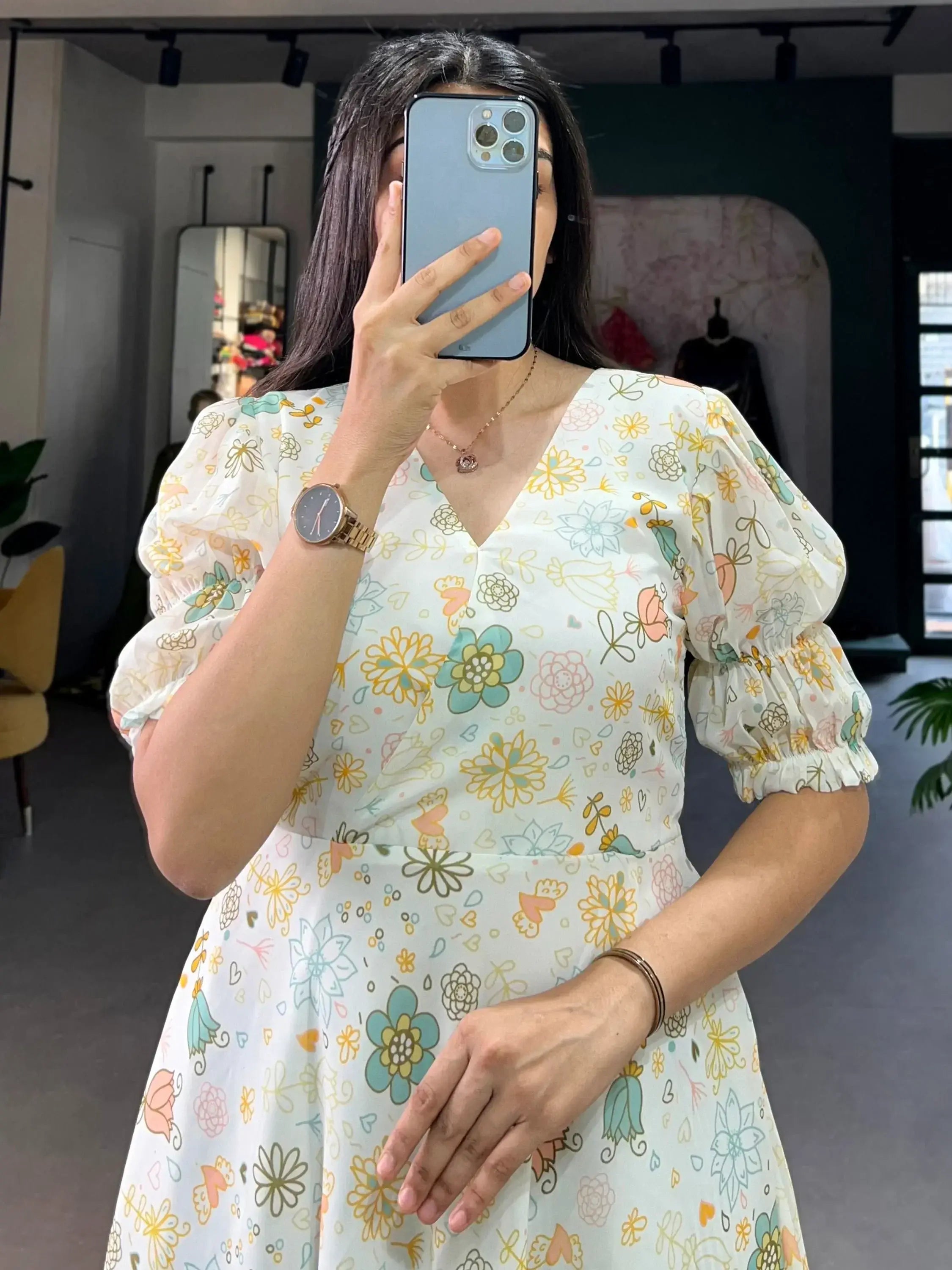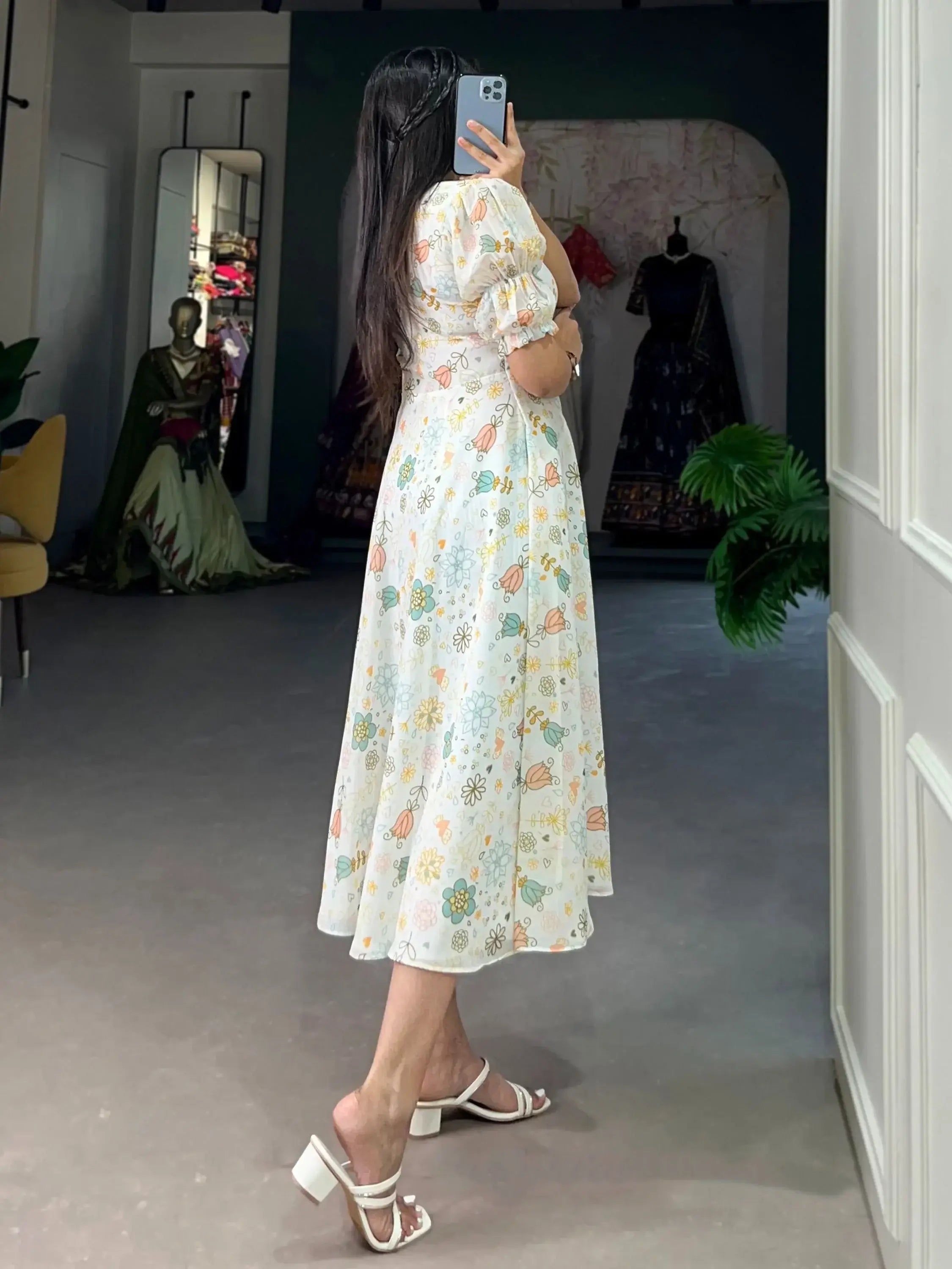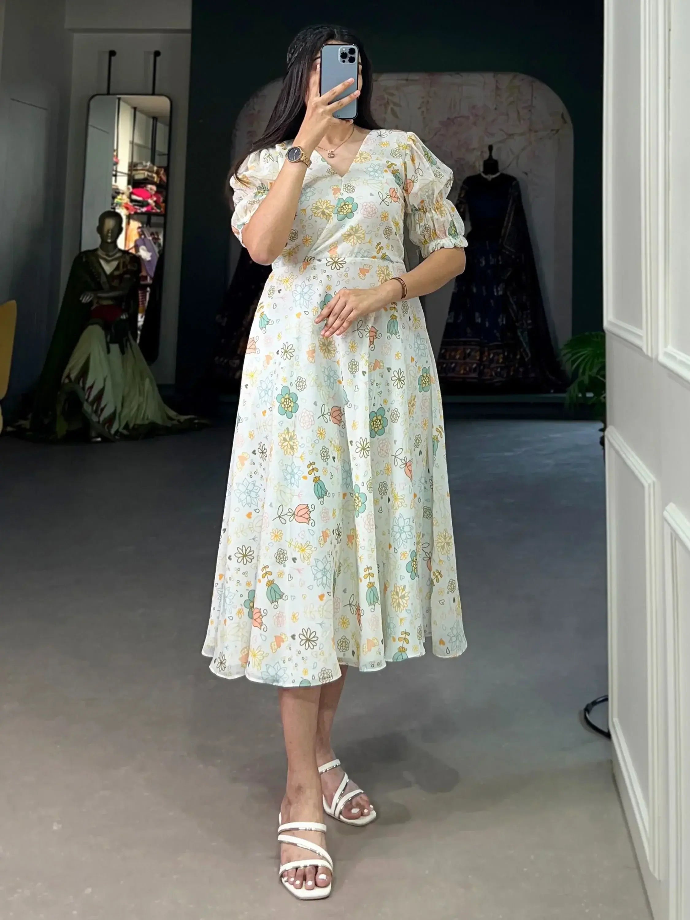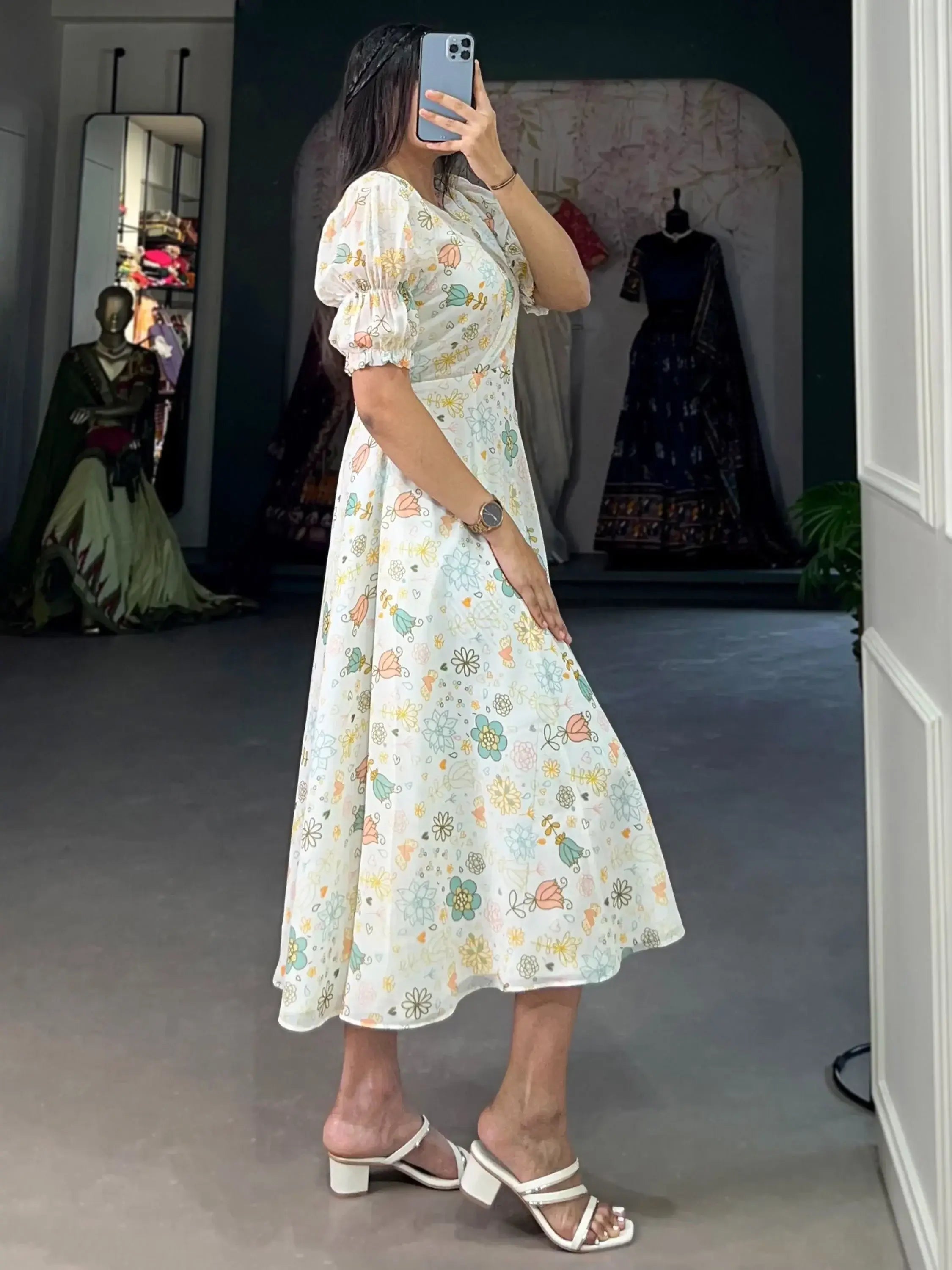 Step into sophistication with our stunning white georgette frock dresses, adorned with exquisite digital prints. These dresses are crafted with care to ensure you not only look fabulous but also feel incredibly comfortable. The lightweight georgette fabric drapes elegantly, creating a flattering and graceful silhouette. The digital prints add a modern and artistic touch, making these frock dresses a perfect choice for any special occasion.