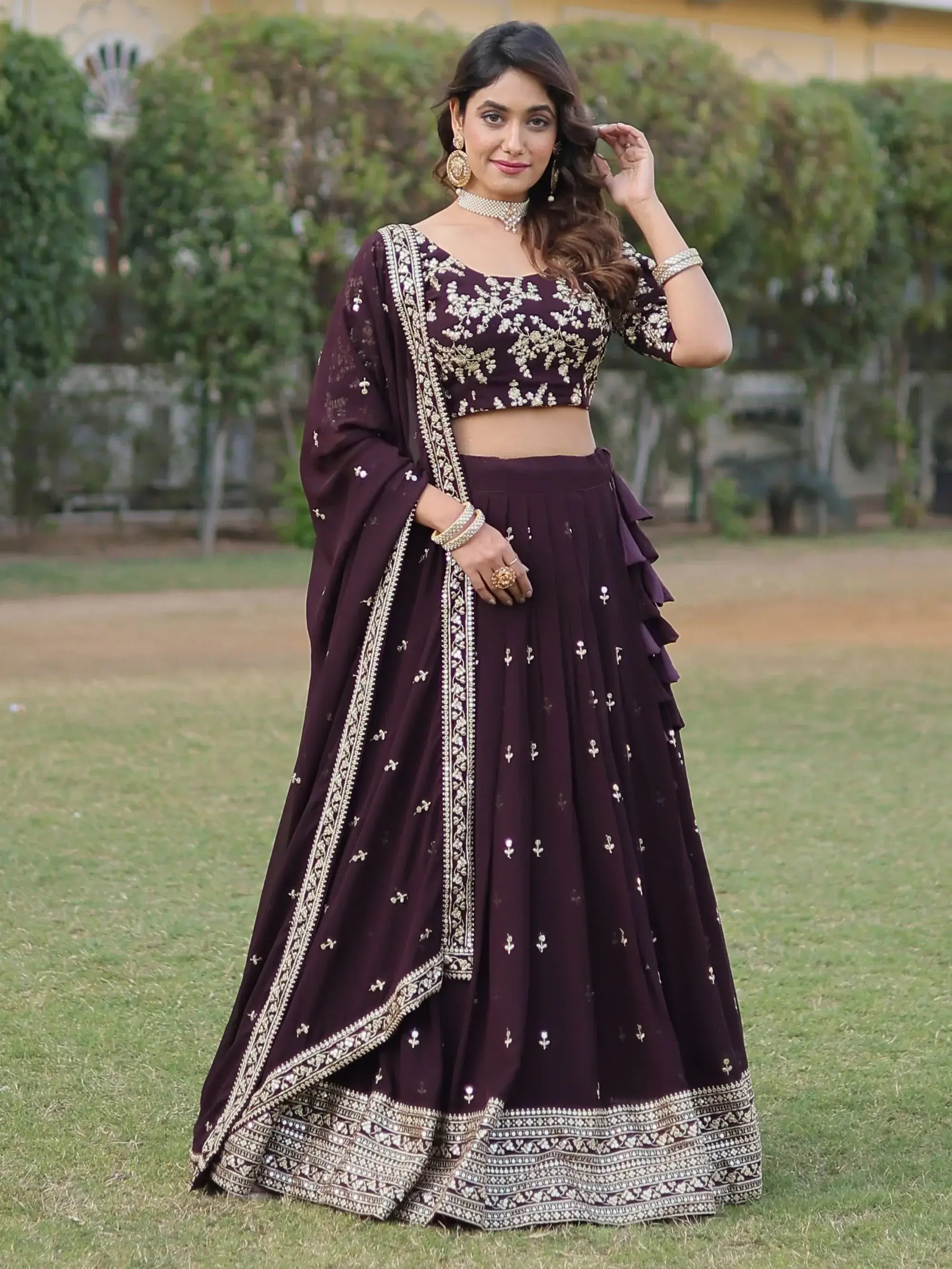 Complete your look with the accompanying georgette dupatta, showcasing multi-embroidered sequins work and an attractive lace border. With a length of 2.30 meters, this dupatta adds a touch of glamour and elegance to the ensemble, enhancing its overall appeal. Whether you're attending weddings, functions, or special occasions, this wine lehenga choli is sure to make a statement, turning heads with its timeless beauty and impeccable craftsmanship.