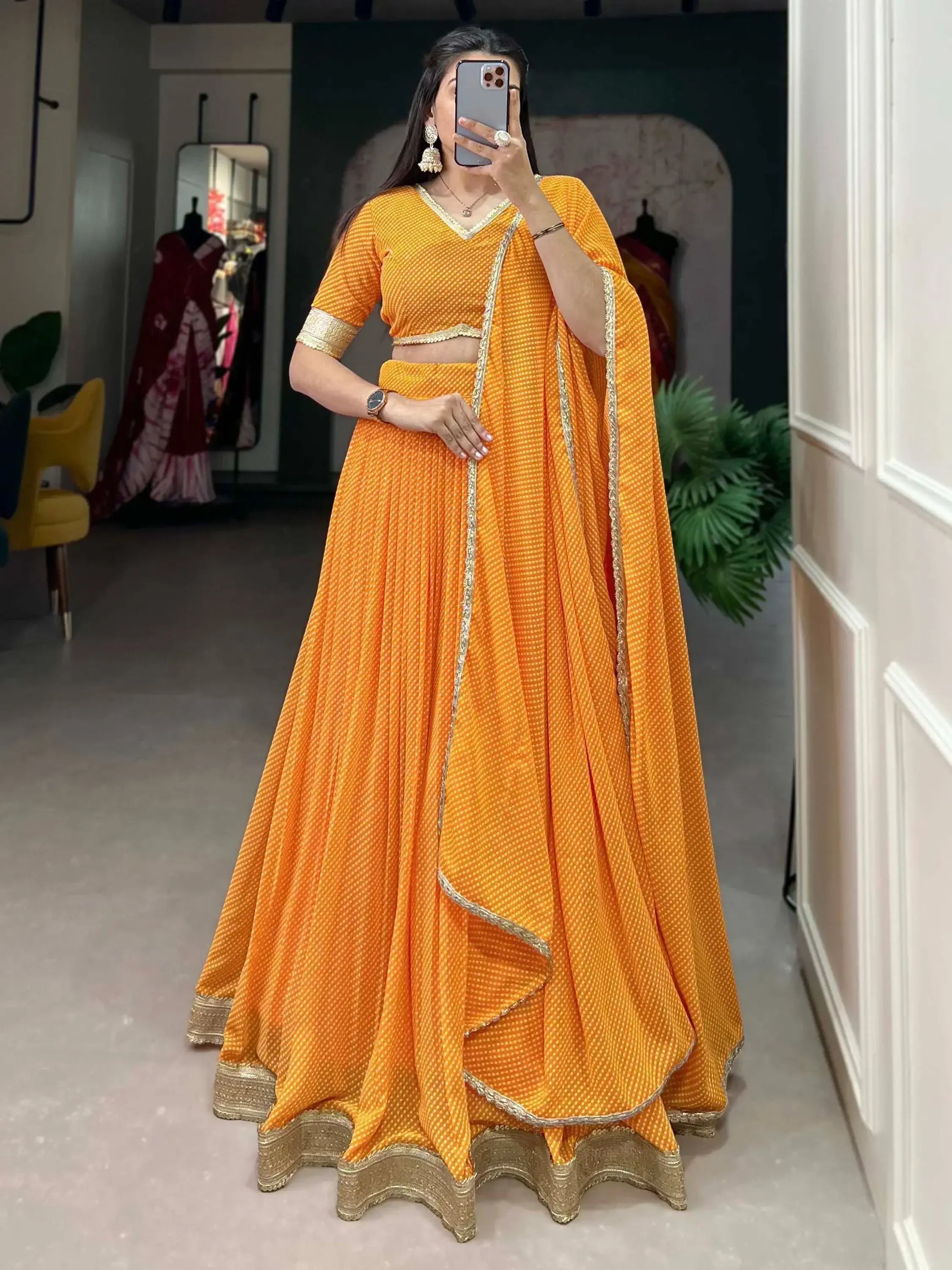 Introducing our stunning yellow digital printed georgette haldi wear lehenga choli, a must-have addition to your ethnic wear collection. This exquisite ensemble features a yellow color georgette material lehenga with digitally printed work and beautiful lace border work, a matching choli, and a dupatta with attractive lace border work. The lehenga is stitched up to 42 inches with a 4-meter flair, 42 lehenga length, and an un-stitched choli 1-meter material, along with a 2.4-meter long dupatta.