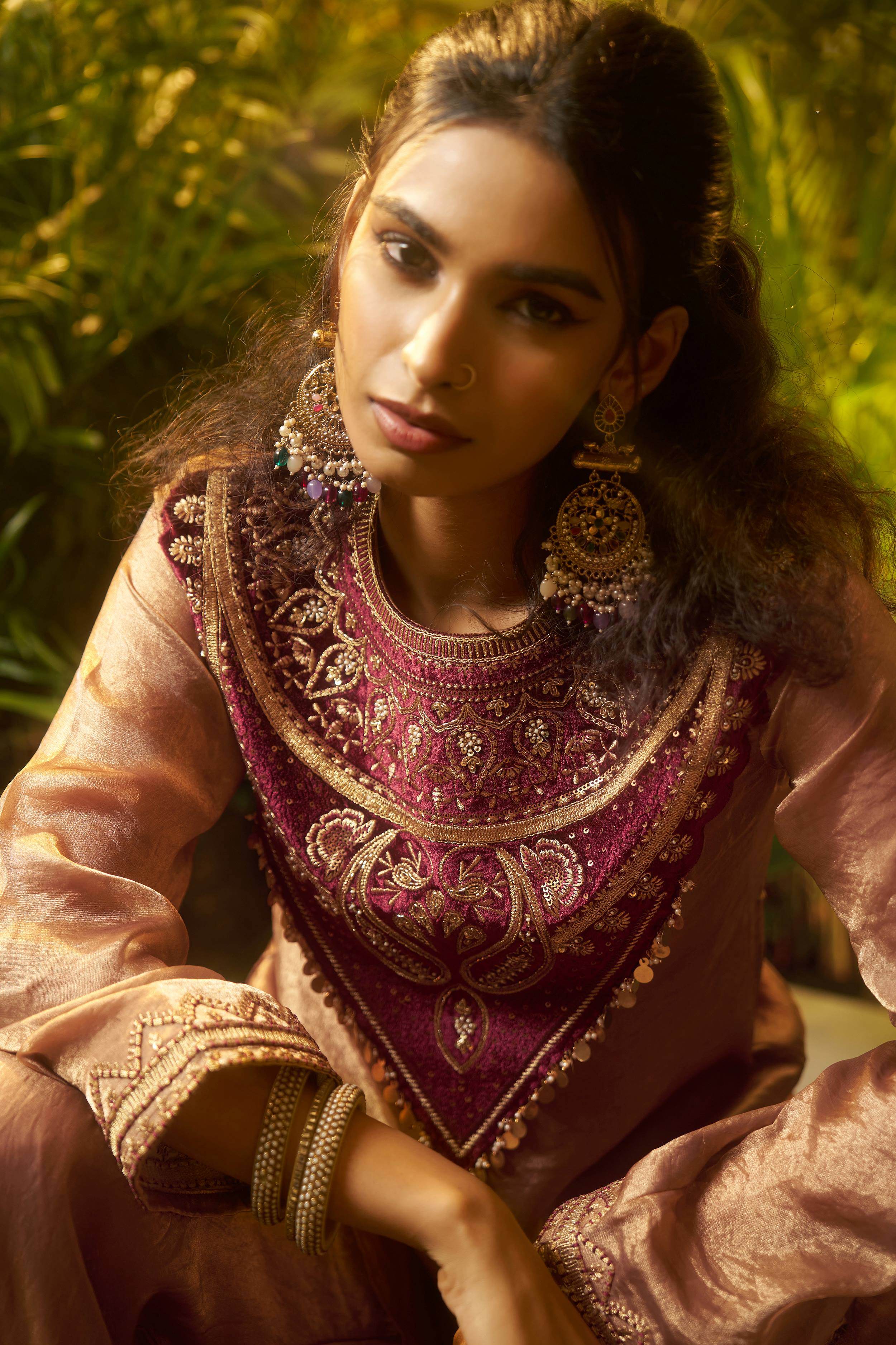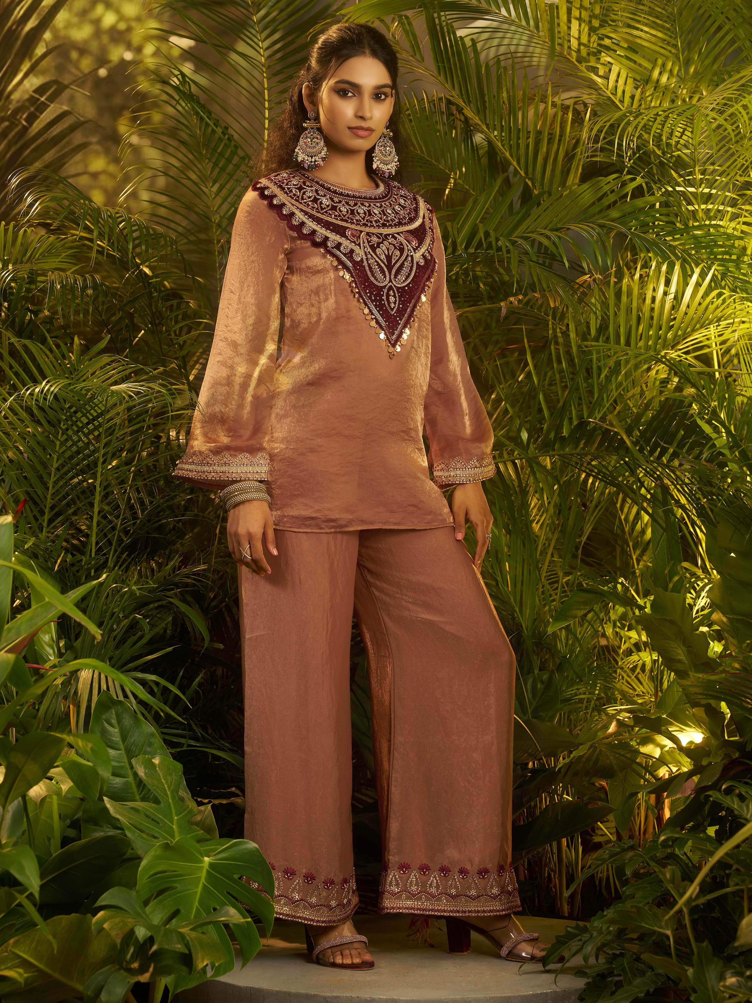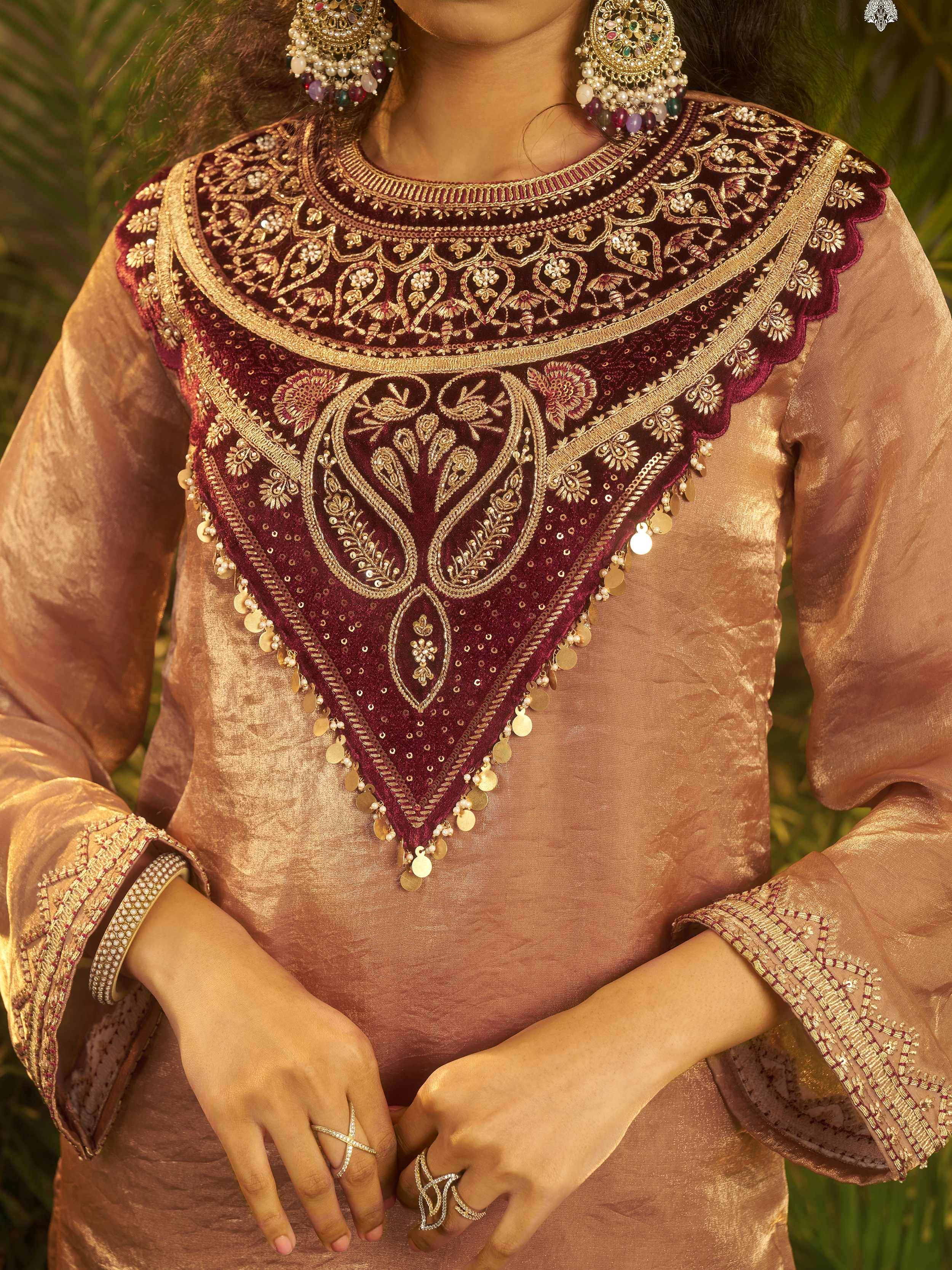 This stunning rose gold co-ord set features a luxurious Fendi fabric top with rich velvet patch detailing in maroon, giving a regal, festive look. The round neck and full sleeves add elegance to the designer silhouette.