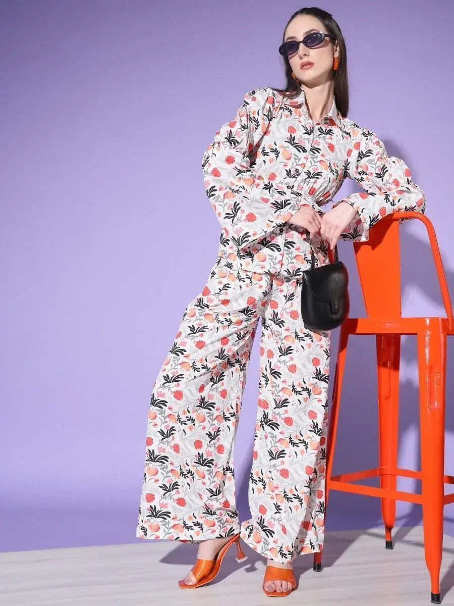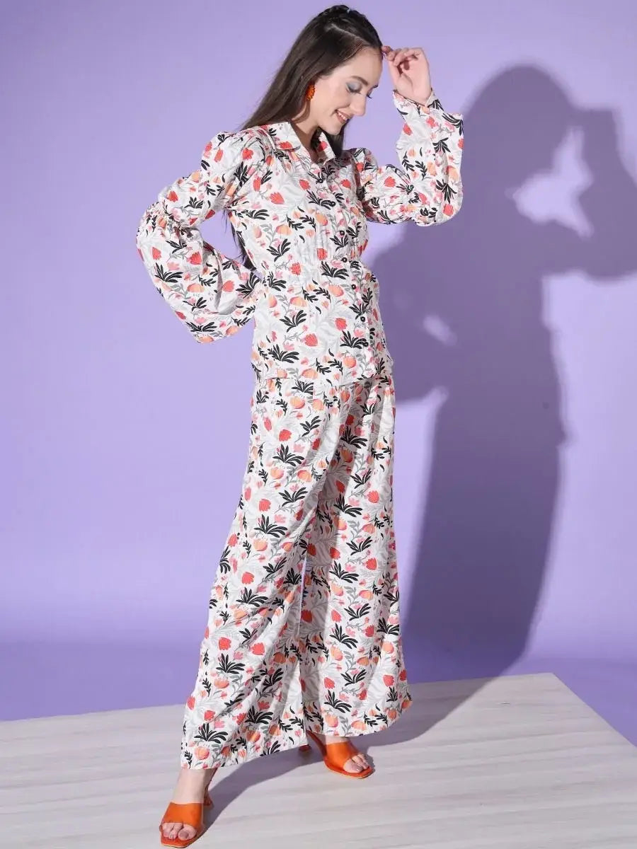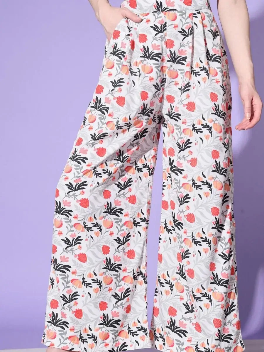 Not only is the Stylish White Floral Printed Platinum Creap Events Wear Palazzo Top stylish, but it is also durable. It is easy to care for, but it is recommended that you dry clean it only for longevity.