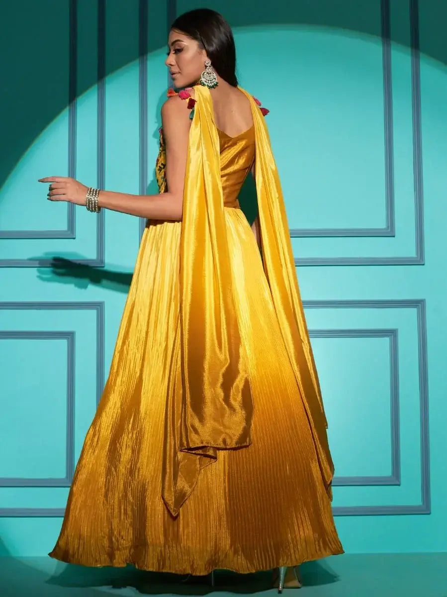 Whether you're attending a Bollywood event, a cocktail or reception, a festival, a party, or a haldi ceremony, this gown is the ideal choice. Its versatile design makes it suitable for a wide range of special occasions, and its vibrant yellow color will make you shine and radiate positivity wherever you go.