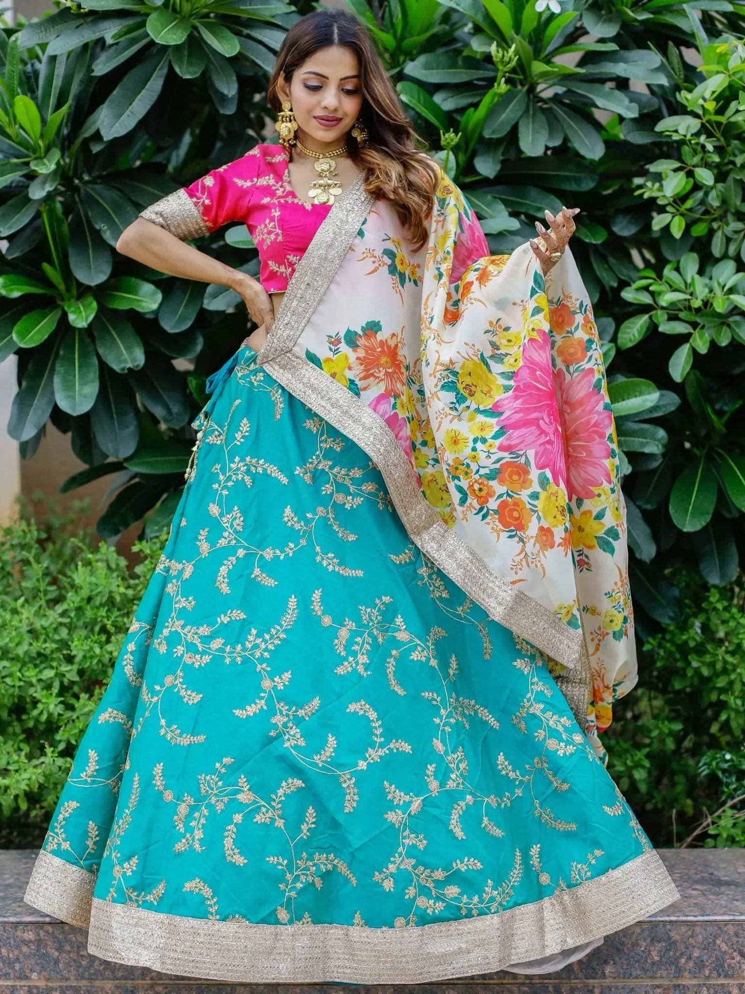 This exquisite lehenga choli also comes with a white lace border and floral print organza dupatta that completes the elegant look. The dupatta is perfect for draping over the head or wrapping it around the neck, adding a touch of elegance. The lehenga is made with art silk fabric, and the sequins work lace border, and dori work make the outfit grand and attractive.