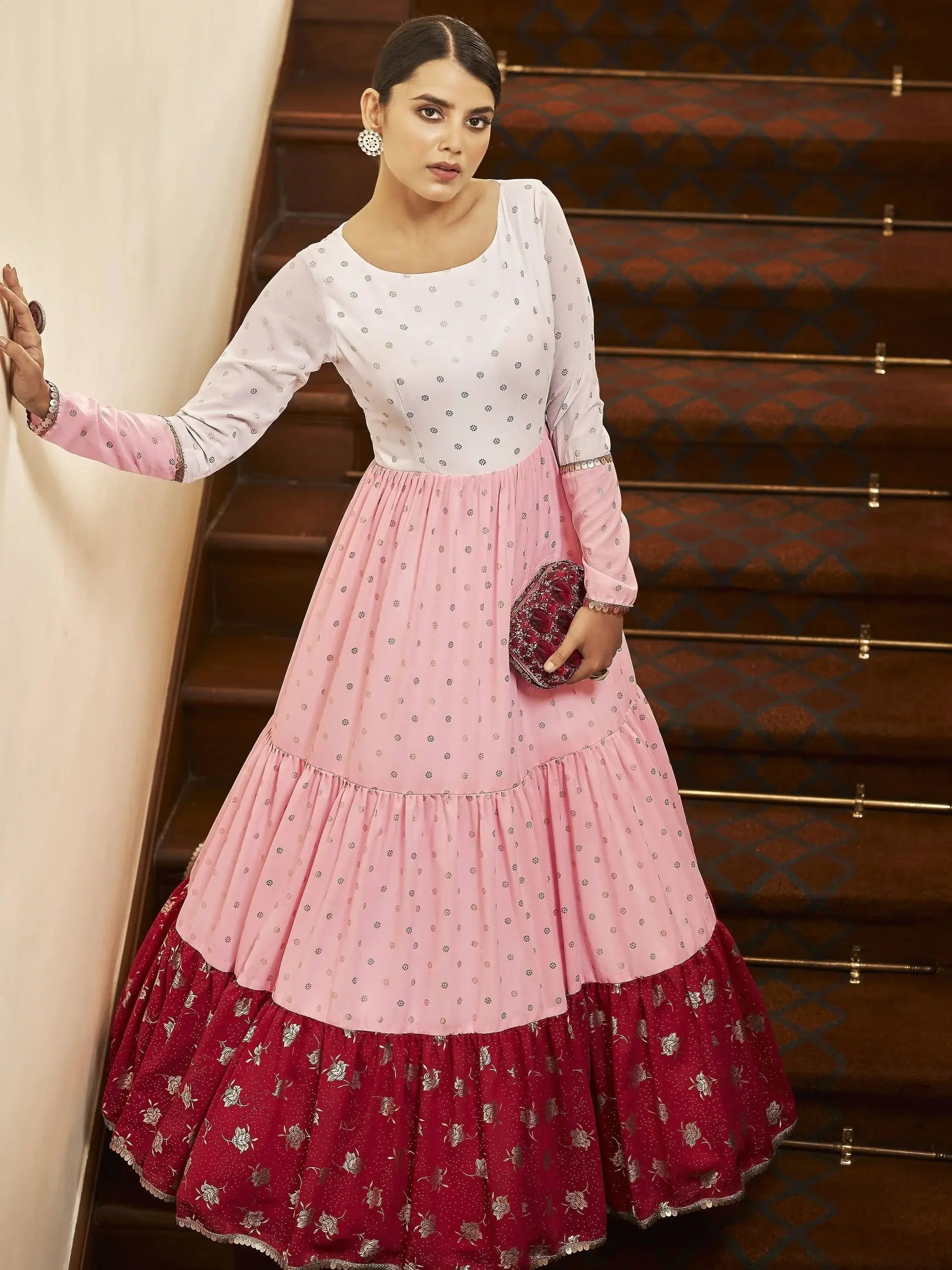 Add a subtle luminosity to your easy-going outfit with this mesmerizing multi-color Anarkali gown made of georgette material embellished with metalic foil work all over.
