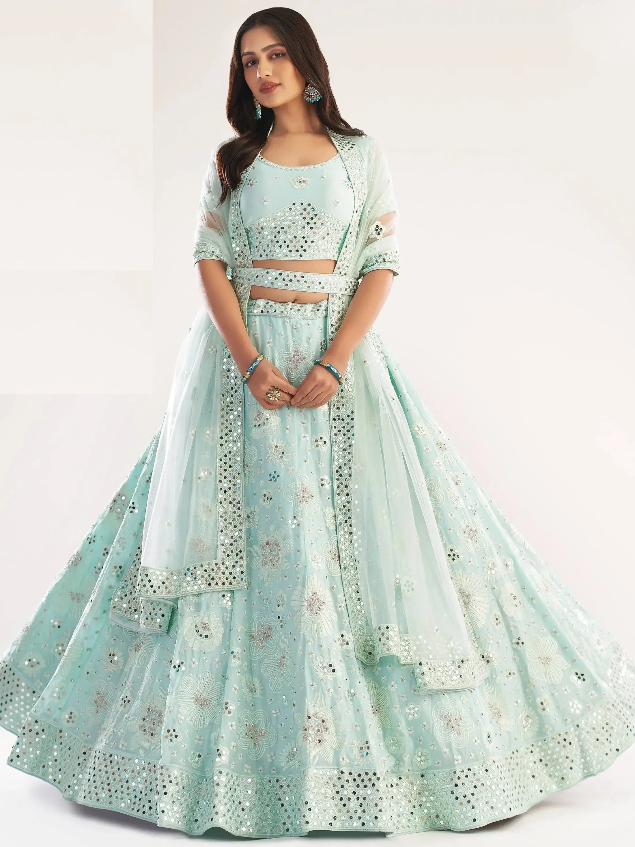 Bring back the traditional charm to your closet with this exceptional sea green color lehenga made of silky georgette material embellished with all-over thread, mirror work, zari embroidery, and heavy zarkan work featured with mirror work belt comes with attached can-can inside.