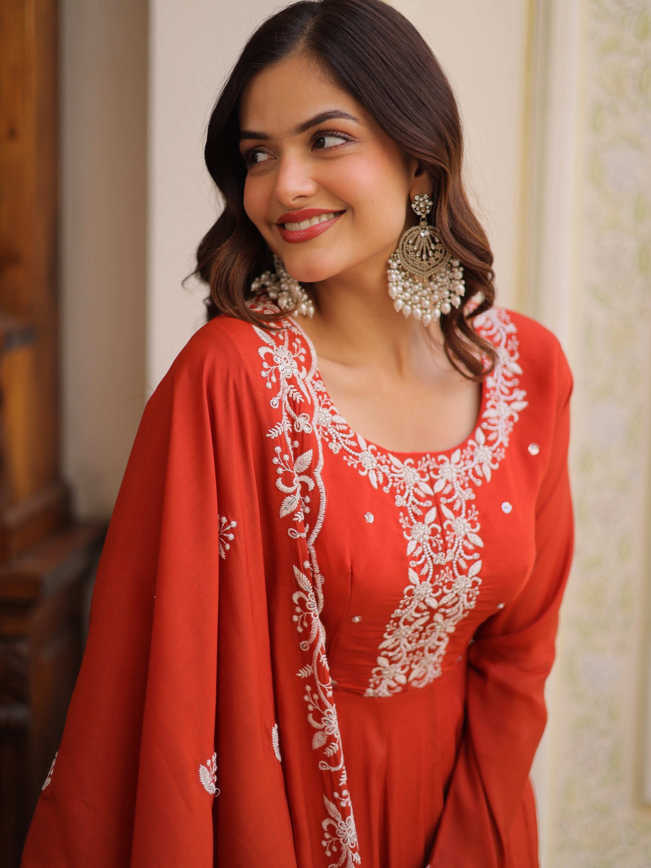 The gown is crafted in rich rust orange Mal Chanderi fabric, giving the outfit a warm and elegant look. It features delicate beads embroidery in soft off-white tones around the neckline and front panel, creating a beautiful contrast with the vibrant orange base.