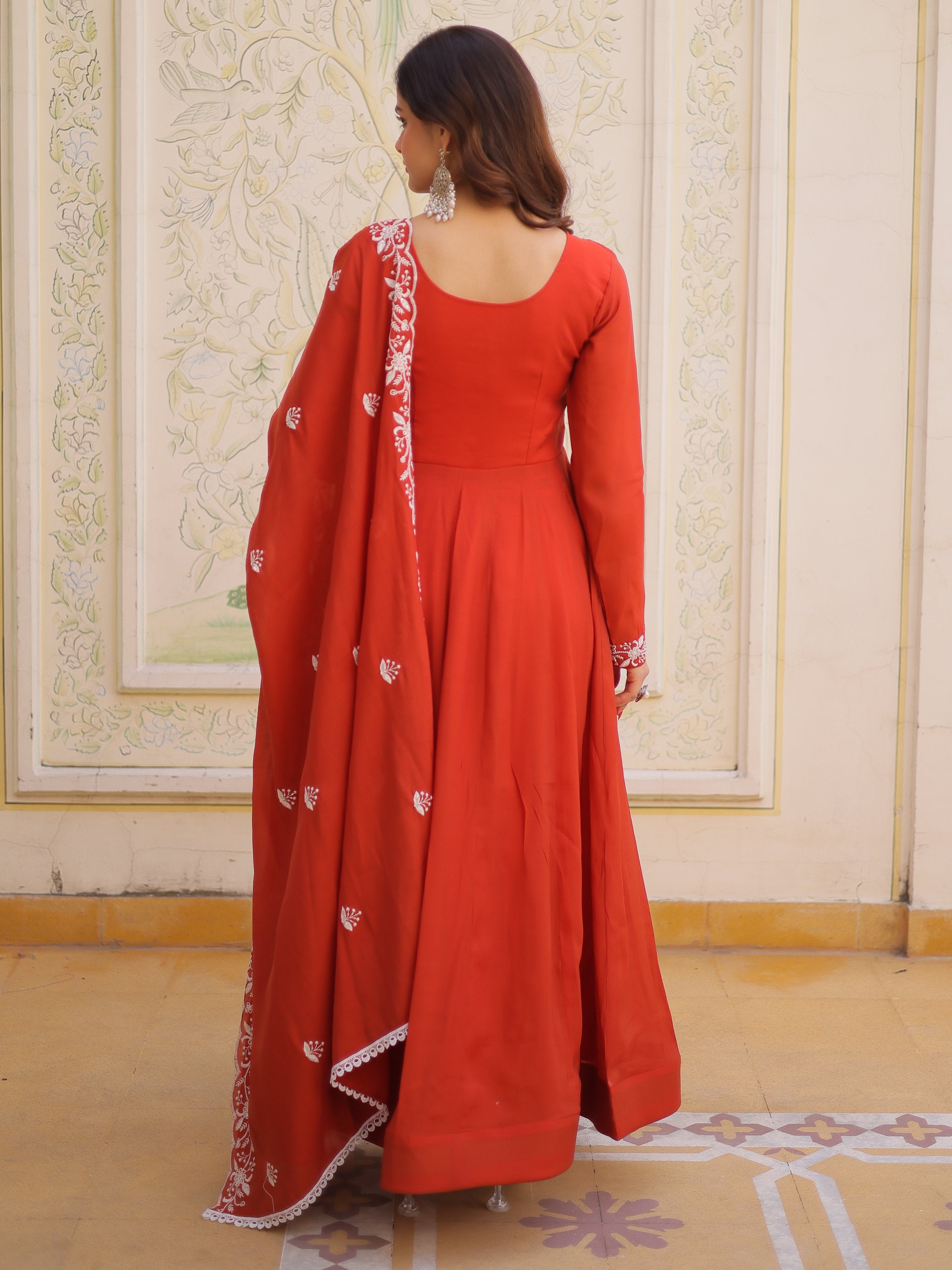 The dupatta is in matching rust orange Mal Chanderi fabric with off-white beads embroidery and designer cutwork lace border, measuring 2.25 meters long.