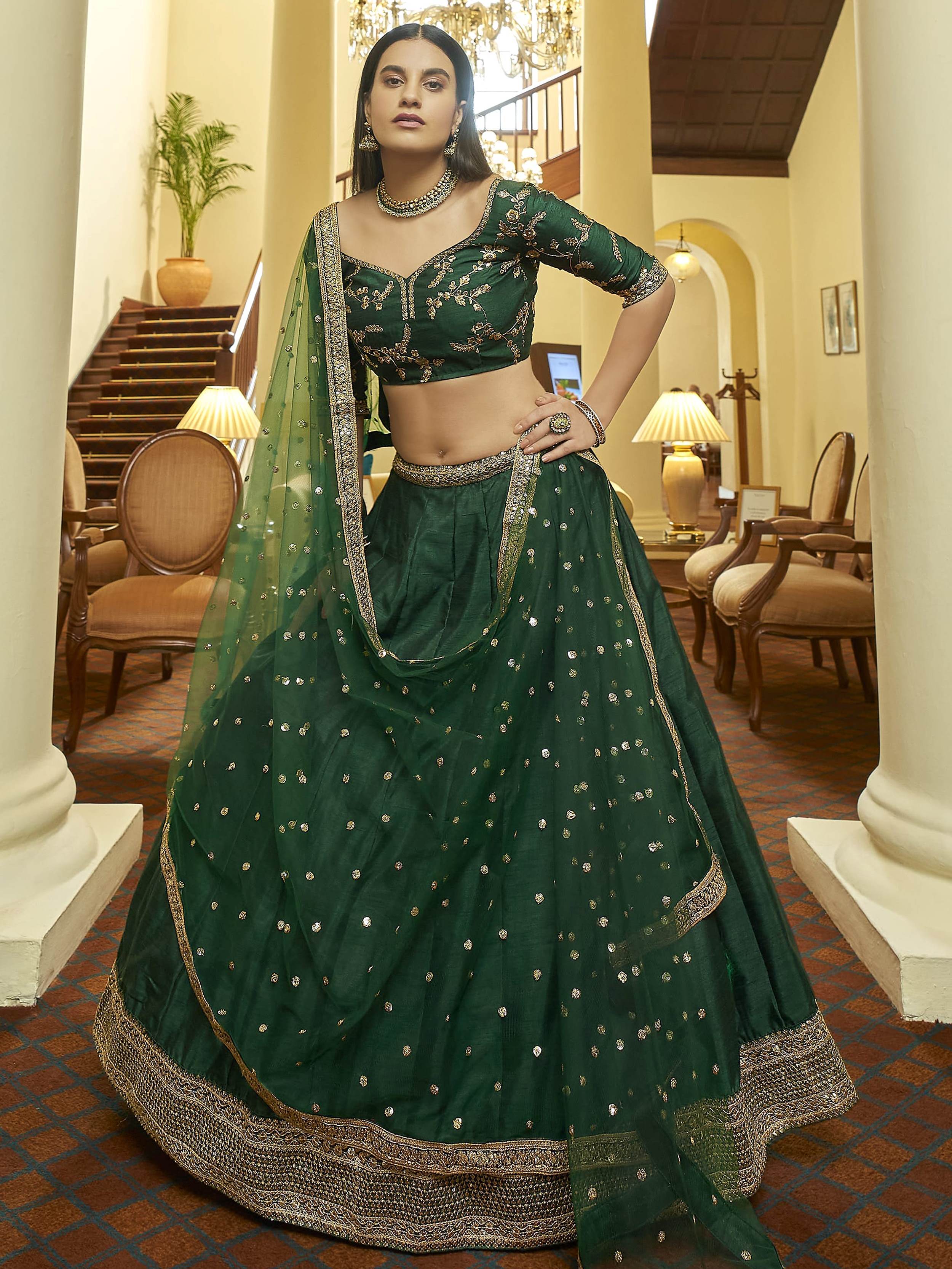 This rich green art silk lehenga choli is beautifully adorned with golden thread embroidery and sequins, creating a majestic festive silhouette. The blouse features detailed floral motifs and a flattering sweetheart neckline for added elegance.