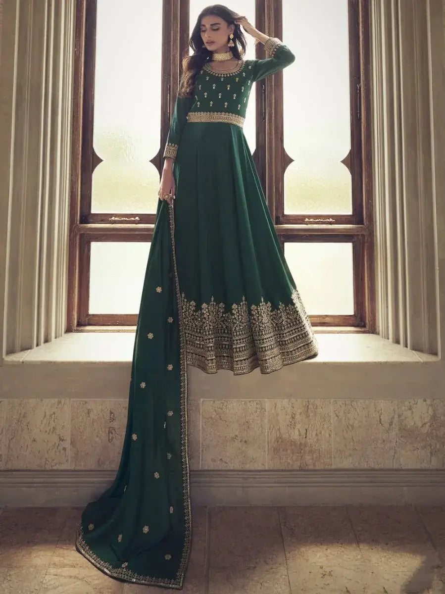 Welcome the season of new beginnings with this graceful and lightweight green embroidered silk sangeet wear ready-made gown. Crafted with impeccable skill and attention to detail, this enchanting gown is sure to make you the center of attention at any event. Made from luxurious silk, this gown exudes elegance and sophistication.