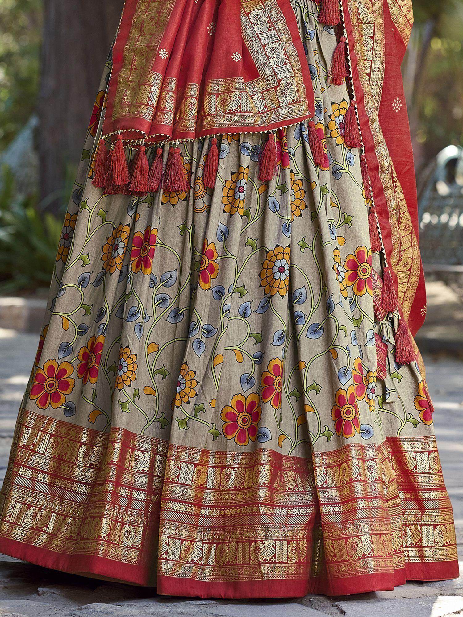 Elevate your ethnic wardrobe with our tantalizing grey Kalamkari printed silk traditional lehenga choli. Crafted from luxurious tussar silk, this stunning ensemble features intricate kalamkari print and foil work that exudes elegance and sophistication. The grey color of the lehenga is versatile and can be styled in various ways for weddings, festivals, and special occasions.