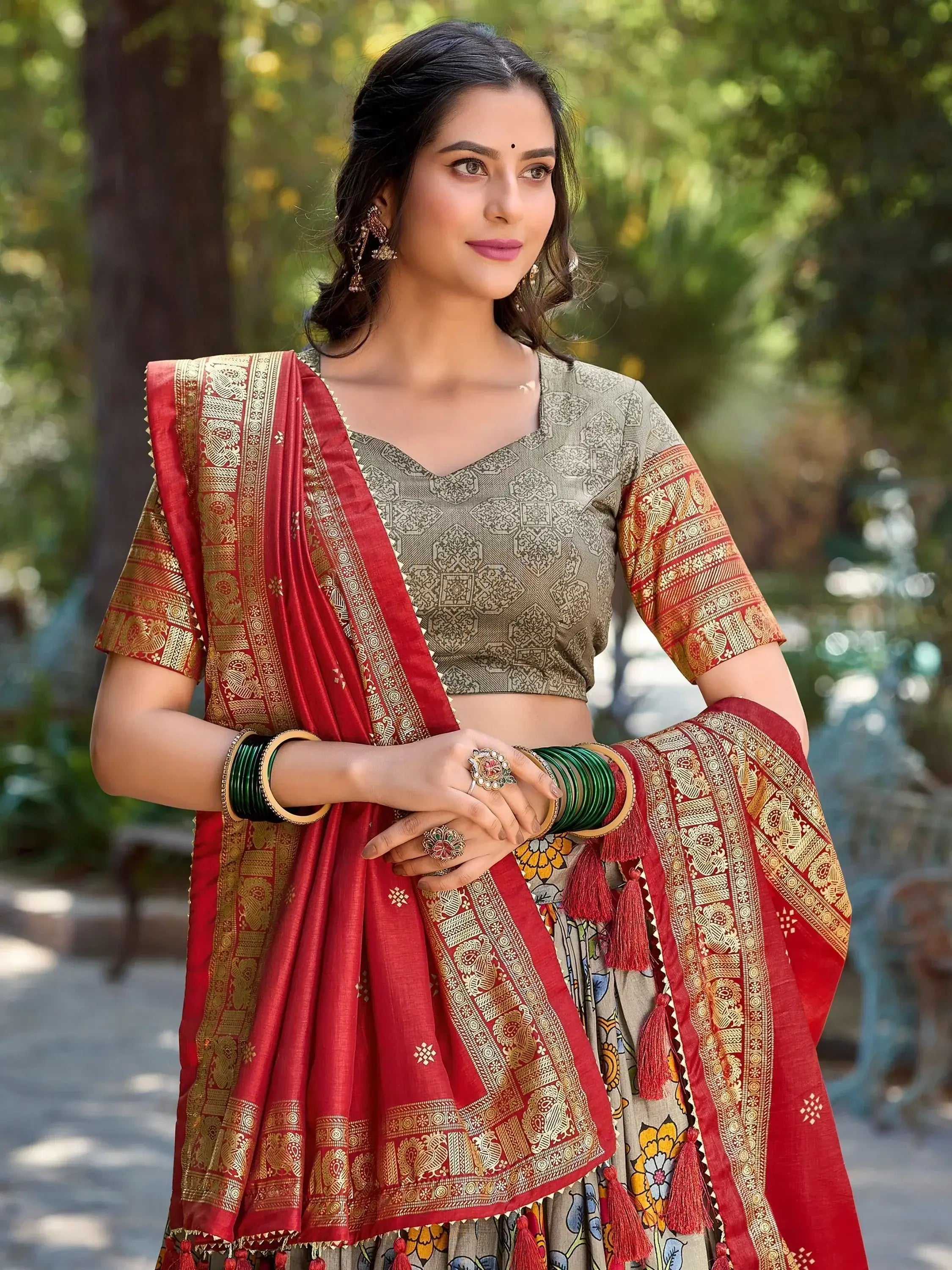 This ensemble includes a grey color tussar silk lehenga with a 3.80-meter flair, a similar color tussar silk choli with printed work and foil work, and a red color tussar silk dupatta with printed work and attached tassels on both sides. The lehenga is stitched up to 42 inches, while the choli is un-stitched with 0.80-meter material. The 2.5-meter-long dupatta adds a touch of grace to the overall look.