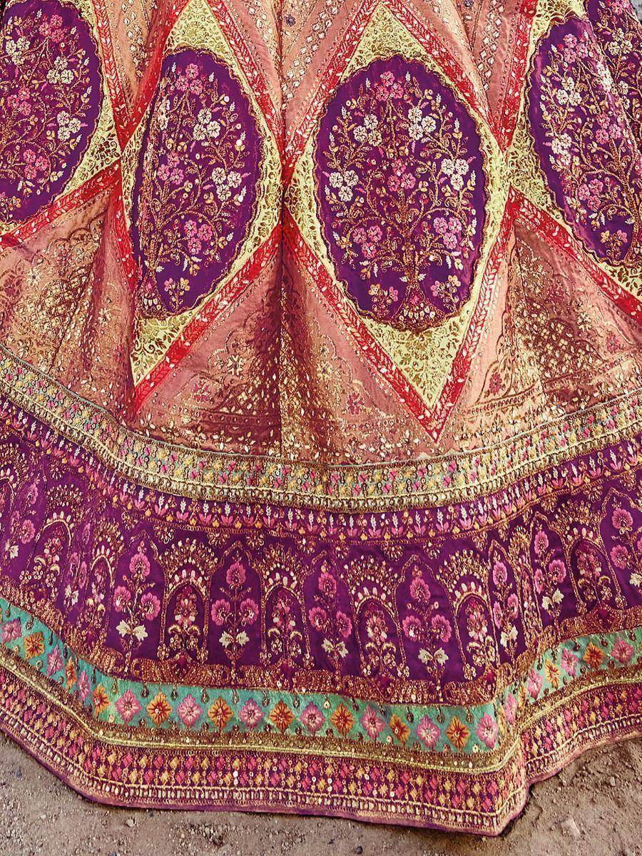 Enhance your wardrobe with the tantalizing peach embroidered jacquard silk bridesmaid lehenga choli from Ethnic Plus. This stunning outfit features a peach color jacquard silk material lehenga adorned with exquisite embroidered work, sequin work, cutwork, butta, and handwork. The choli, in a beautiful shade of purple satin material, is also beautifully embellished with embroidery, sequin work, cutwork, butta, and handwork. Completing the look is a brown georgette dupatta with delicate embroidery, sequins, lace, and attached tassel work.