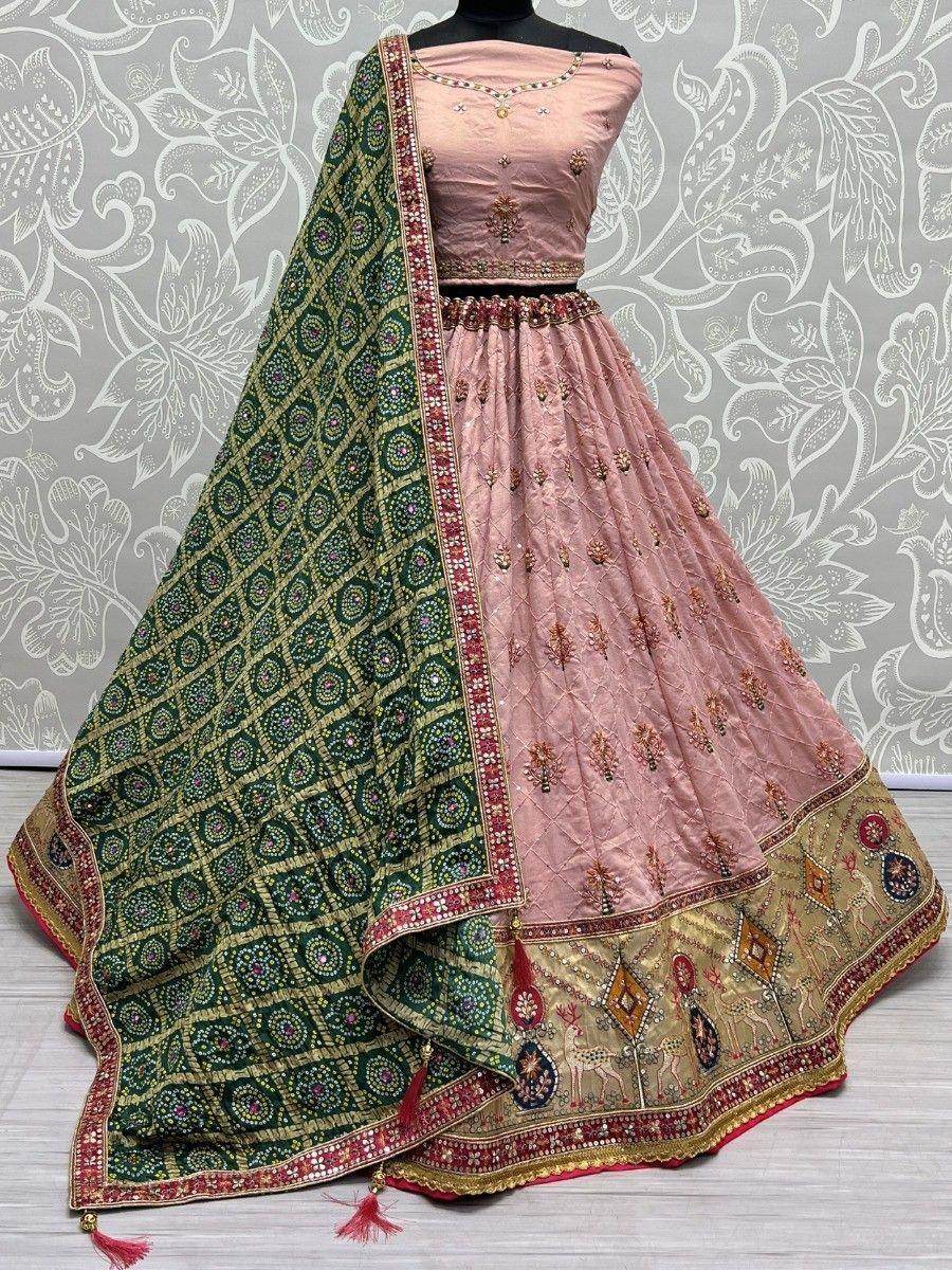 Introducing the exquisite tantalizing peach sequins silk wedding wear lehenga choli with dupatta from Ethnic Plus. This beautiful ensemble is made from high-quality peach color gadhawal silk material, adorned with fancy embroidered work, sequin work, zari work, and zircon work. It includes a semi-stitched lehenga and a choli, both crafted with utmost precision and attention to detail.