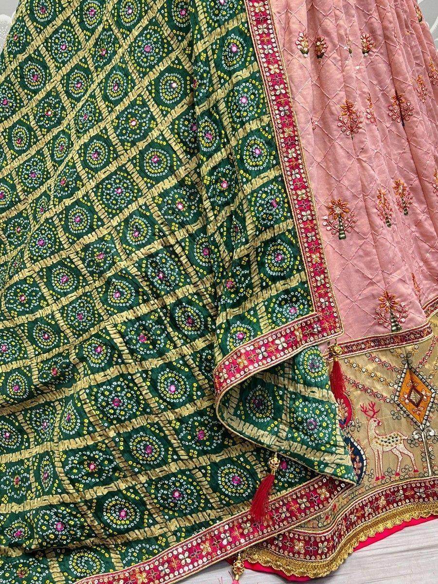 Paired with the lehenga and choli is a stunning green color chiffon dupatta. It features bandhani print work, paper mirror work, and a fancy lace border, adding a glamorous touch to the entire ensemble.