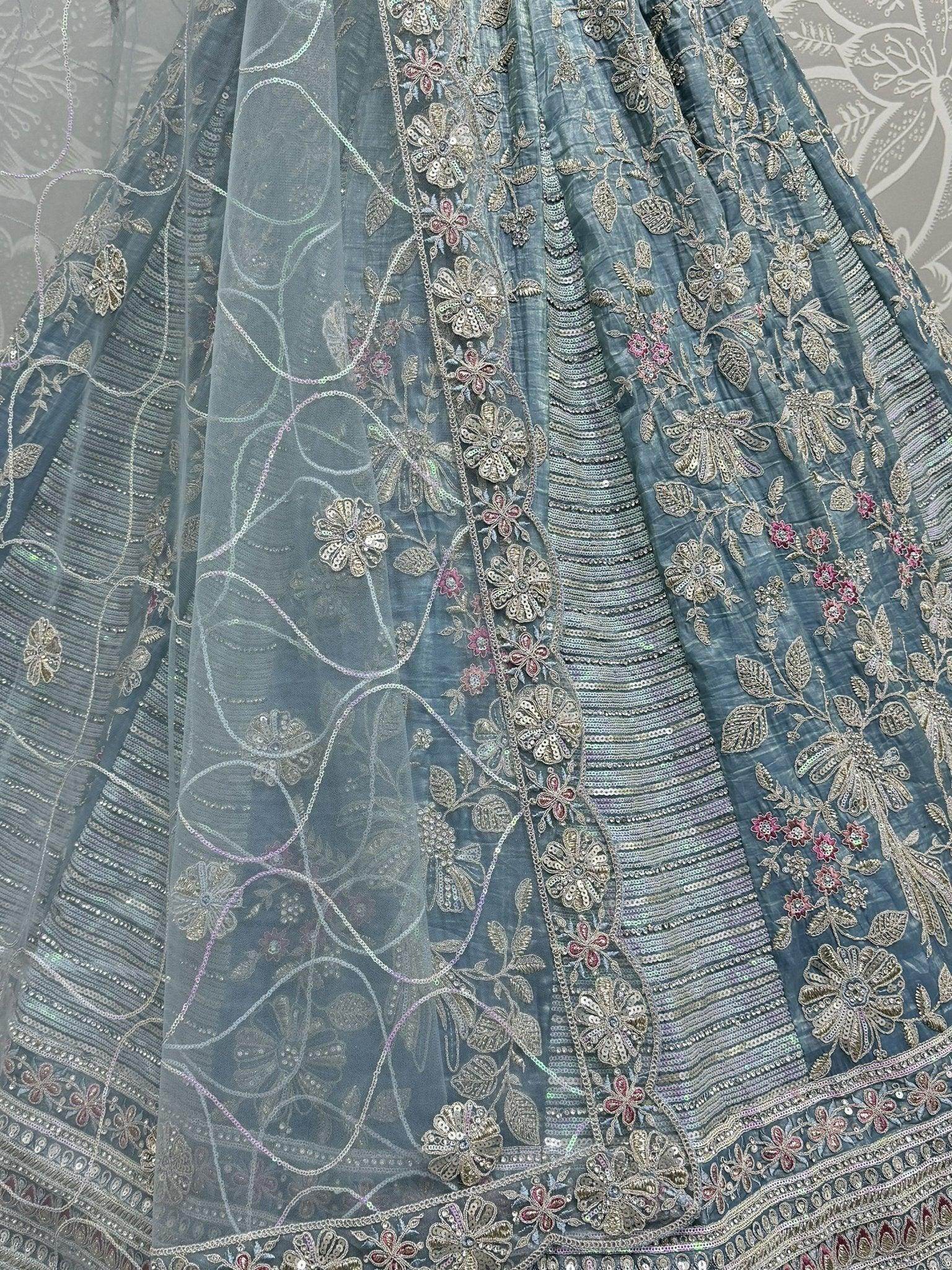 Completing the ensemble is a delicate net dupatta that adds an ethereal touch. The lace embellishments and charming butta work along its edges serve to enhance the overall grace of your attire. Whether you're dancing at a wedding or mingling at a festive gathering, this blue silk lehenga promises to make you the center of attention, embodying the essence of beauty and tradition.