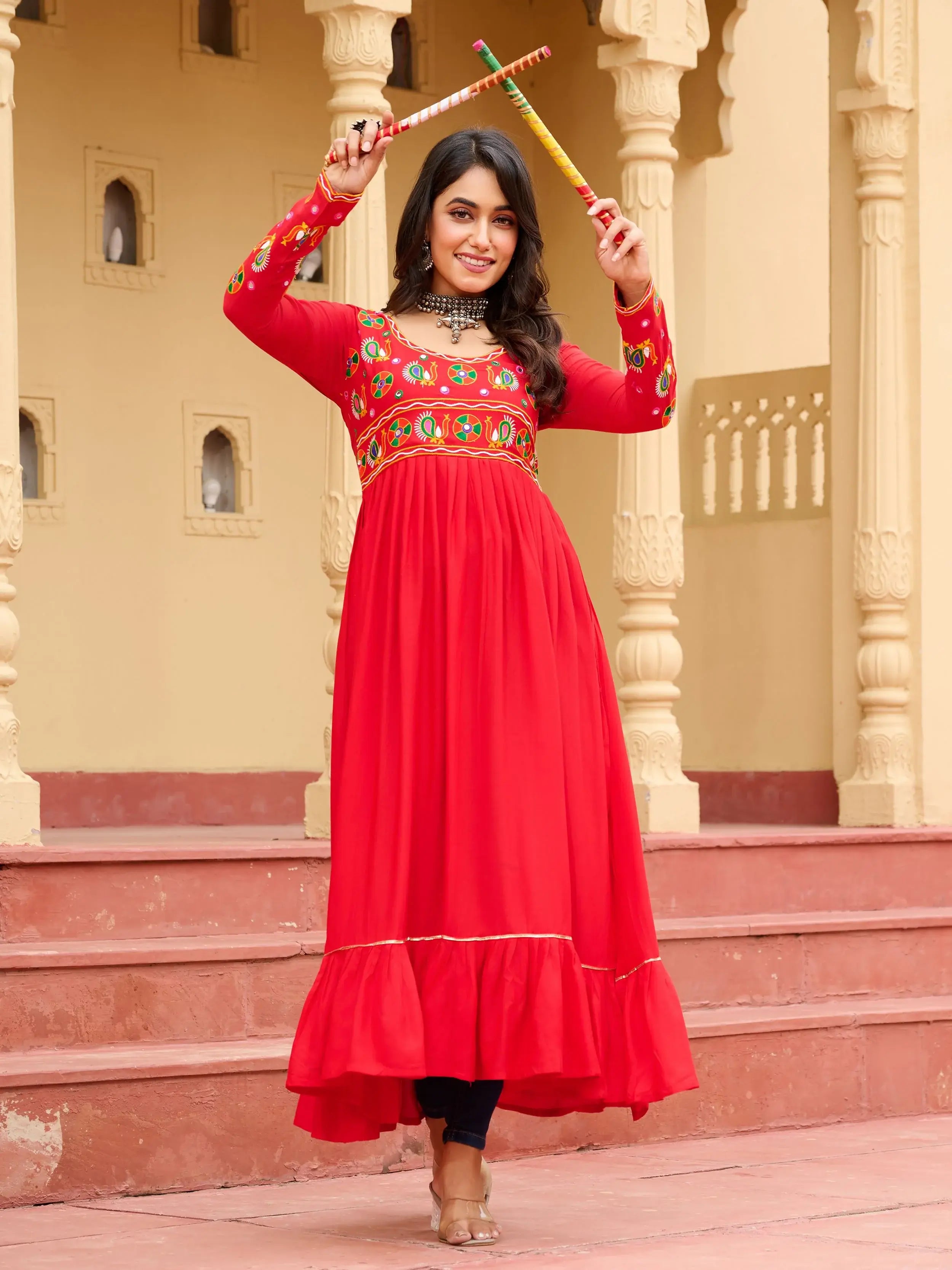 The radiant red rayon fabric brings out the festive charm with its elegant flare and soft drape. The intricate Kutchi Gamthi embroidery on the front and sleeves adds vibrant traditional detail that makes it perfect for Navratri nights.