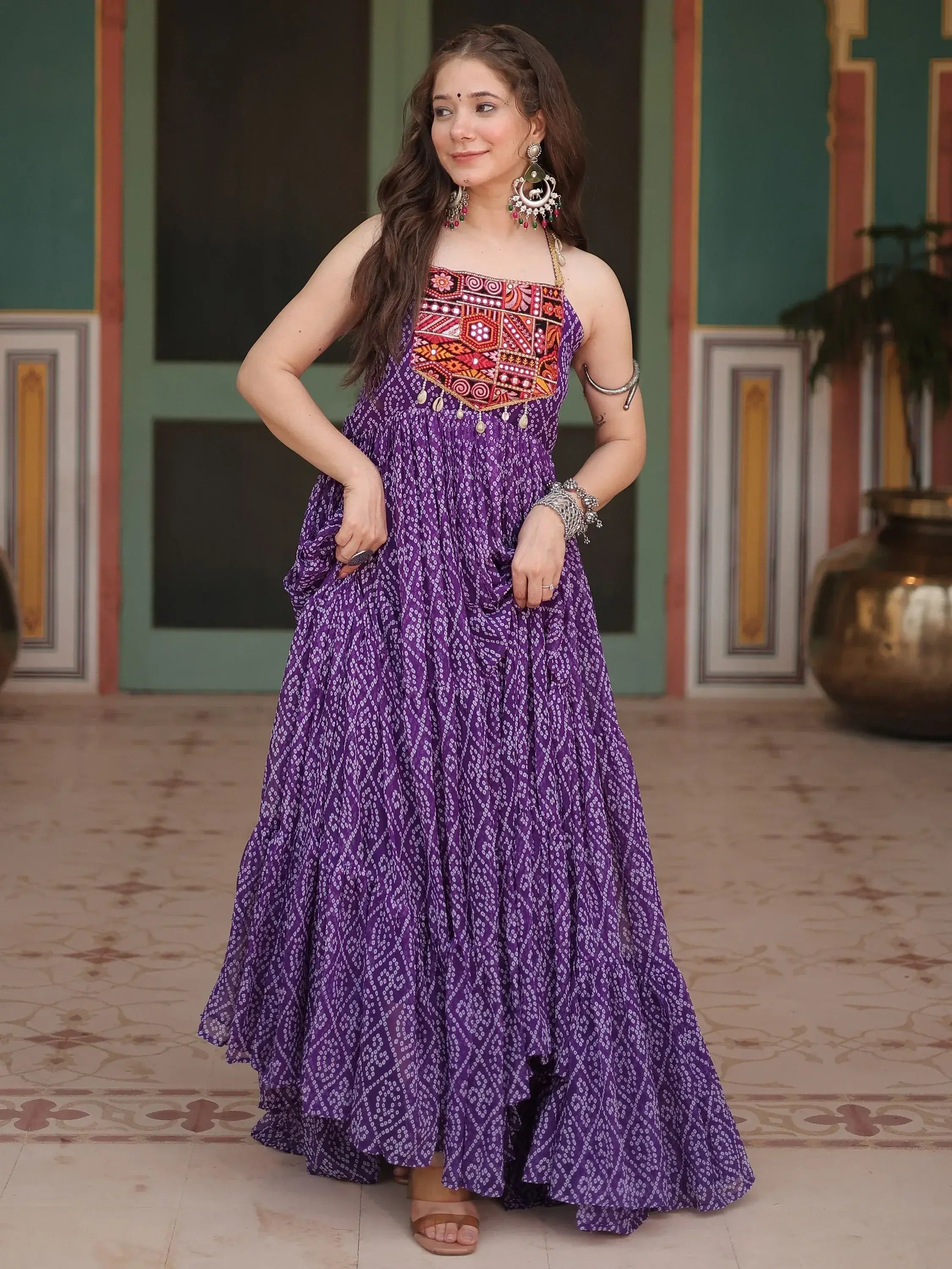 Experience the vibrancy of navratri with our stunning purple bandhani printed georgette gown from ethnic plus. Crafted from luxurious georgette material, this gown features intricate bandhani print work paired with elegant kutchi patchwork for a truly festive look.
