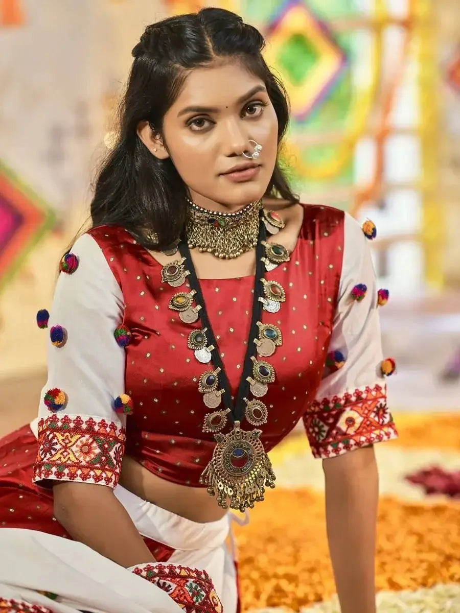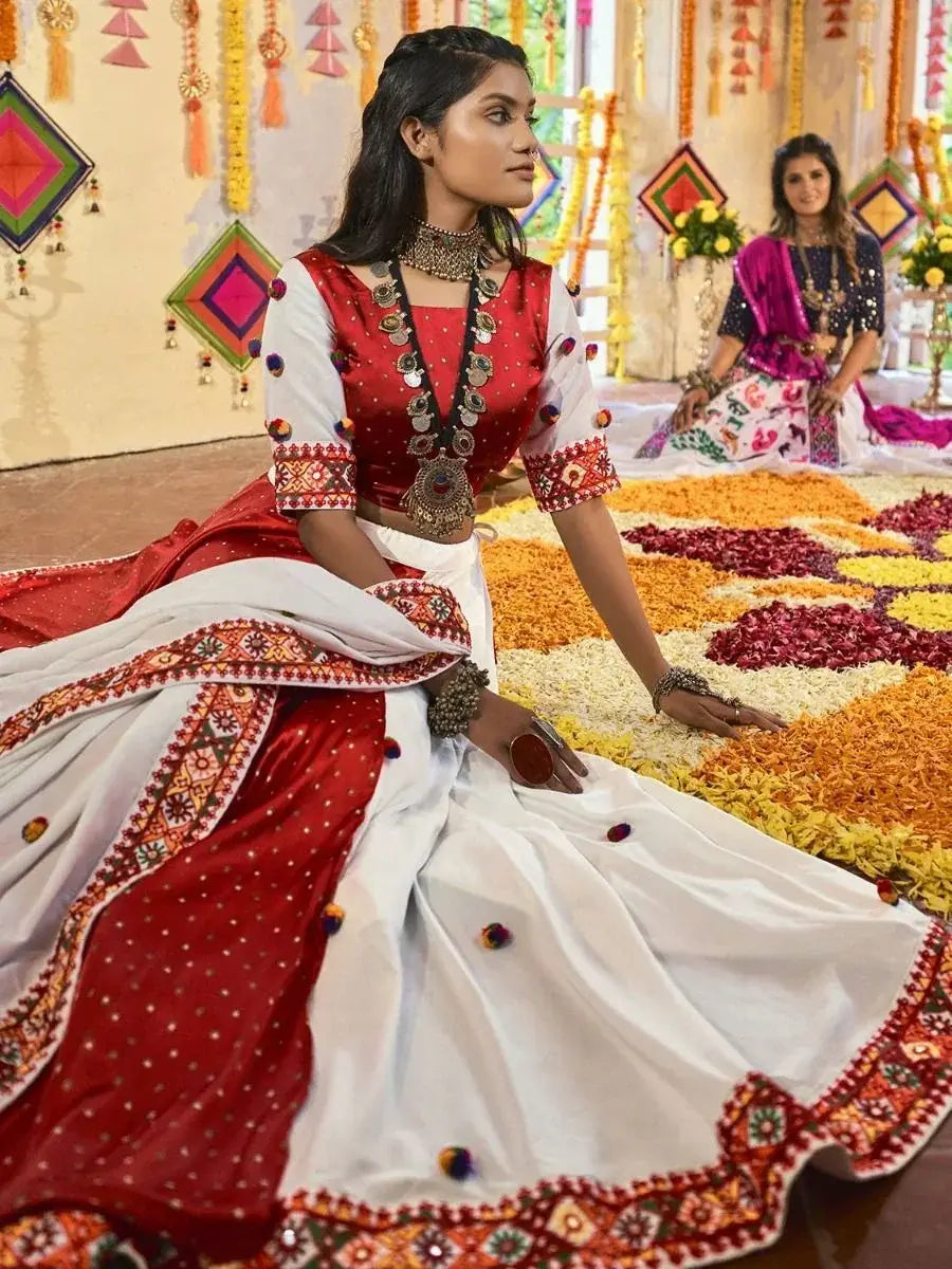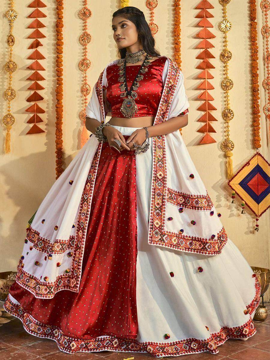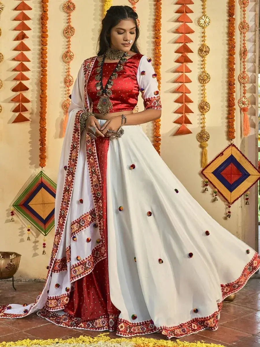 This traditional white & red color Ghaghra is semi-stitched up to 42 inches in length and 42 inches waist and comes with fully unstitched 1-meter choli material.