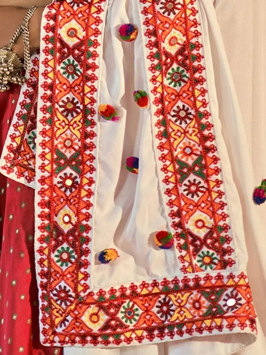 Look stylish, traditional, and fashionable wearing this white & red colored maslin cotton material with full flair Ghaghra garnished with red colored thread embroidered with all-over pompom pasting added with print work (8.5 mtr Flair).