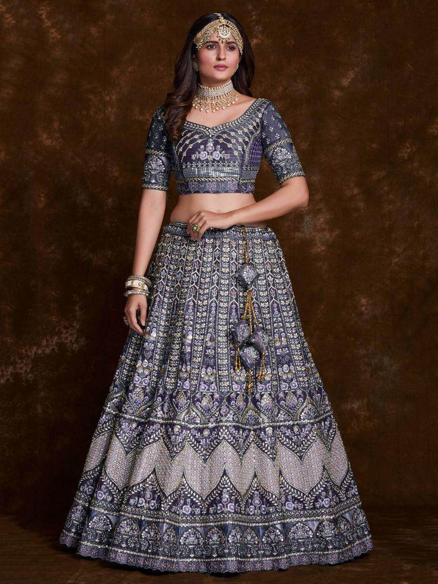 We proudly present our masterpiece, the vibrant violet embroidered art silk wedding lehenga choli, tailored just for you. This splendid attire boasts a violet choli and lehenga, crafted with pure art silk for a luxurious feel. But what truly makes it stand out is its astonishing craftsmanship.