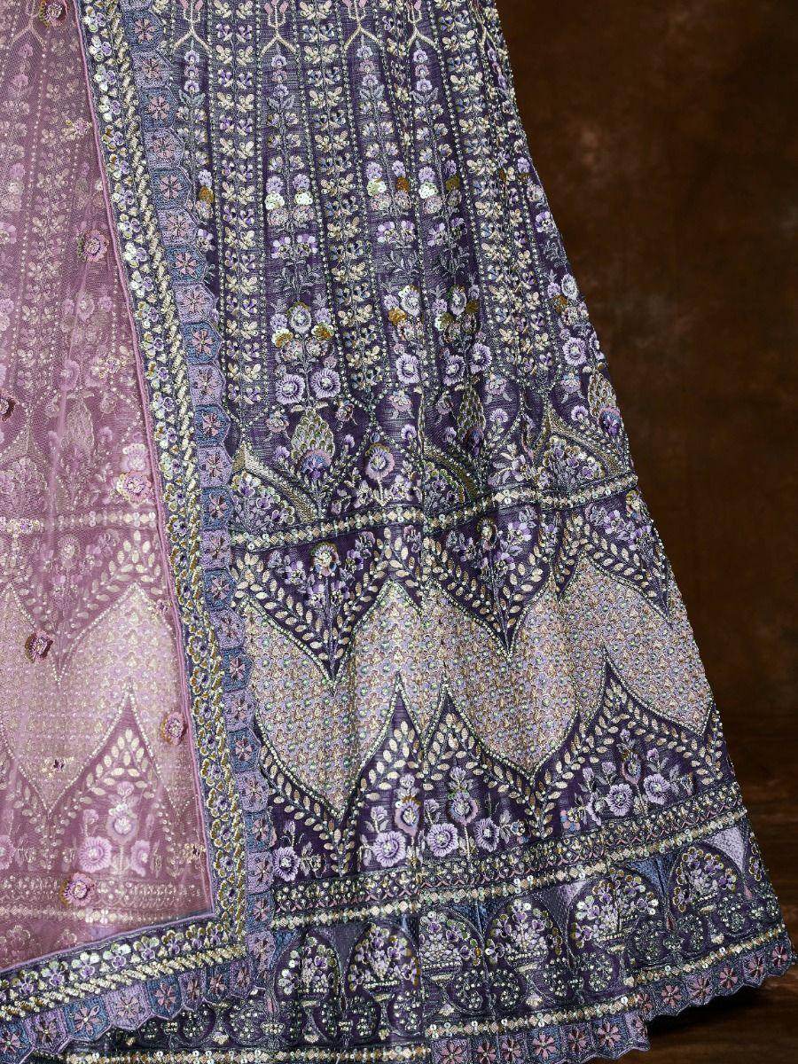 To add an extra touch of elegance and sophistication, the vibrant violet lehenga choli comes with a perfectly matching soft net dupatta. This ethereal accessory drapes gracefully over the shoulders, completing the look with grace and charm.