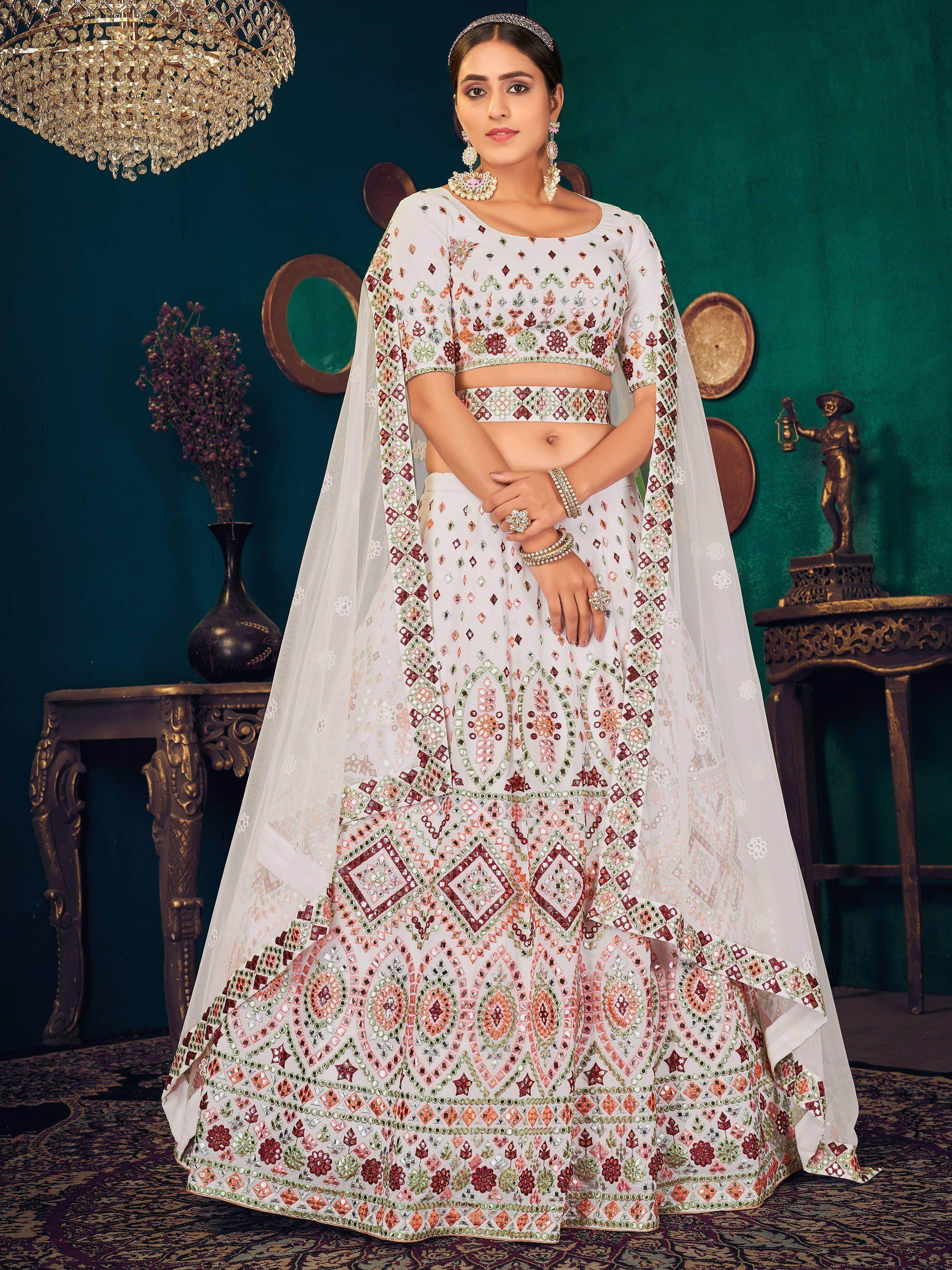 Steal everyone's heart and attention by wearing this dazzling white color lehenga made of georgette material embellished with all over multi-thread embroidery work and gotta patti work featured with embroidery belt comes with attached can-can inside.